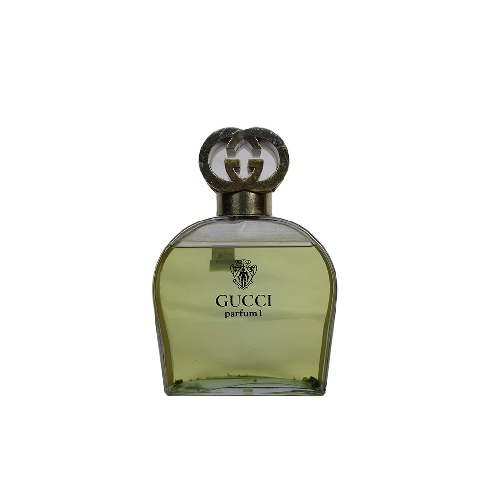 GUCCI raro flacone pubblicitario in vetro prodotto in edizione promozionale per le vetrine delle profumerie negli anni 70 ispirato al profumo Gucci Parfum I , questo flacone oversize presenta un corpo bombato in vetro trasparente con liquido decorativo verde-giallo e tappo sormontato dal celebre logo doppia G dorato in rilievo h cm 30 x 20 x 7