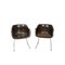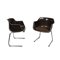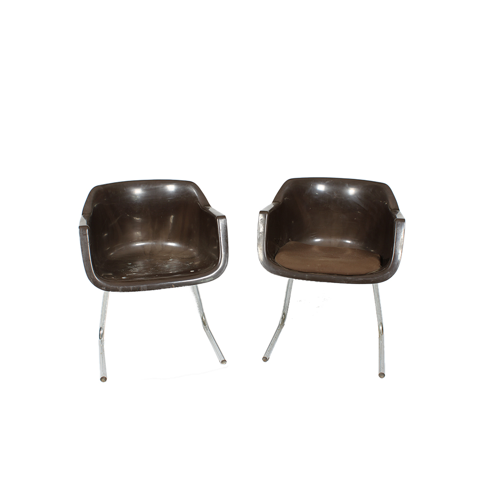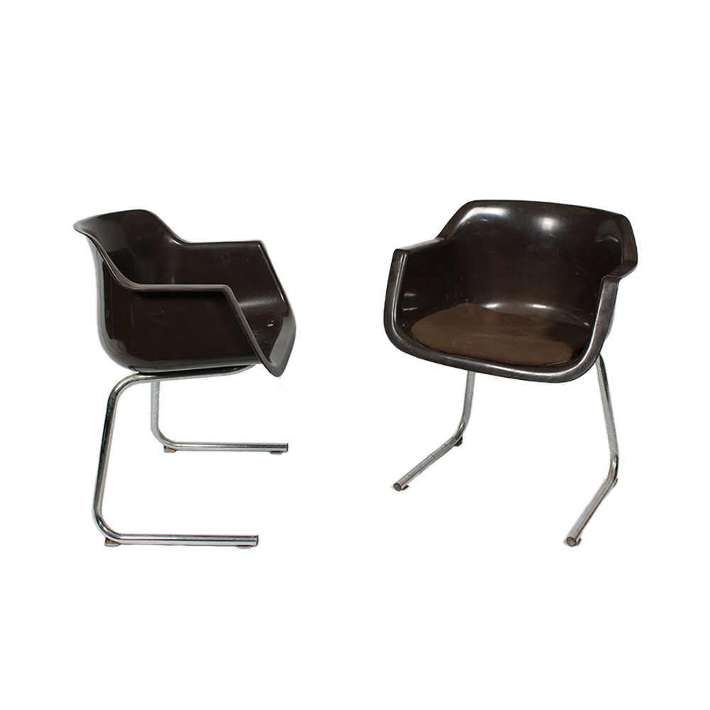 COPPIA DI POLTRONE scocca in materiale plastico con gambe in acciaio, logo impresso sotto la seduta. Condizioni buone con normali segni del tempo, una poltrona priva di imbottitura nella seduta, produzione italiana anni 60-70 h cm 76 x 58 x 50