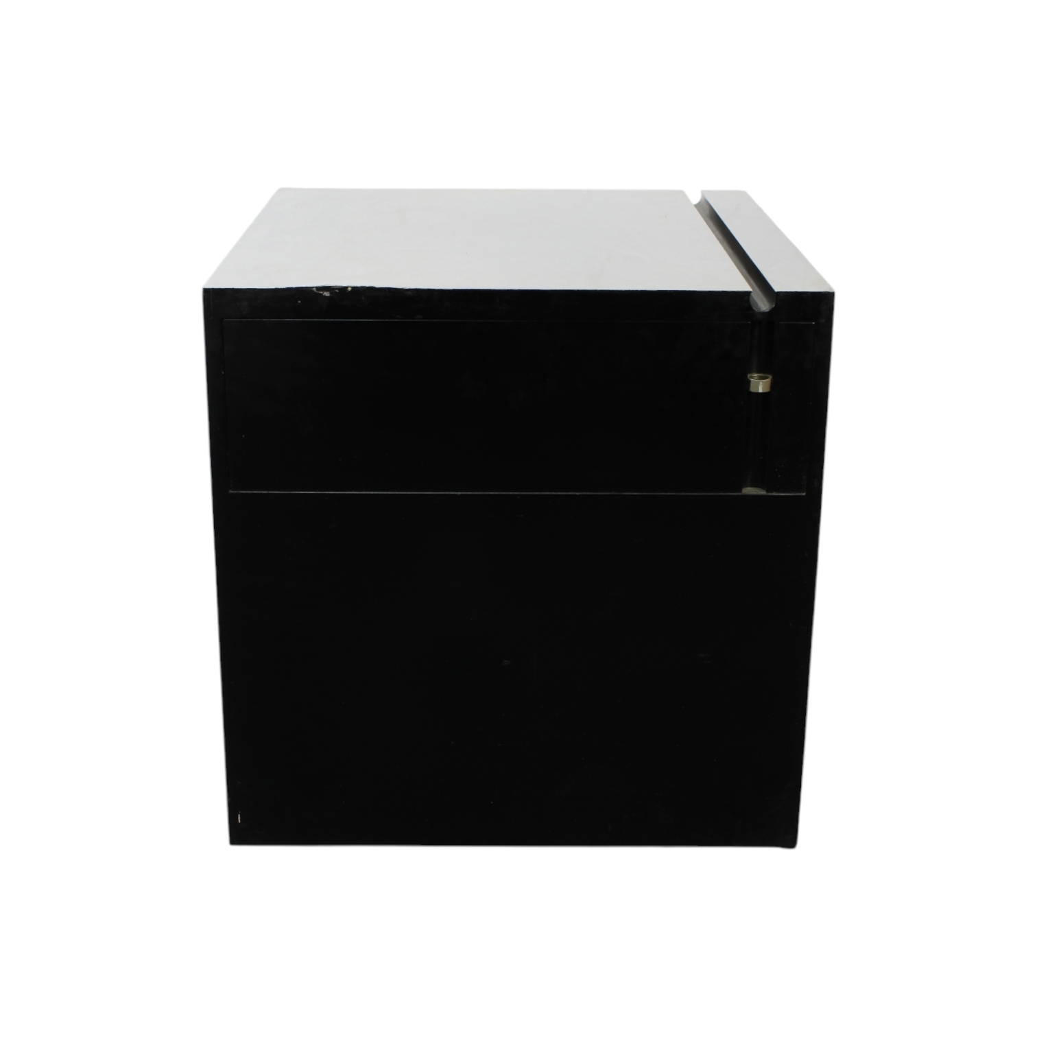 MOBILE BAR MODELLO CUBO realizzato da Sin & Nils , iconica produzione del design italiano del secondo 900. struttura geometrica essenziale con superficie in finitura scura lucida e piano superiore in acciaio satinato. Interamente concepito come mobile contenitore/bar, di forte impronta funzionalista e gusto modernista, tipico del design italiano degli anni 70. L'esemplare si presenta in buone condizioni generali, con normali segni d'uso e del tempo, più evidenti sul piano in acciaio, coerenti con età e l'utilizzo. Italia anni 70 h cm 69 x 62
