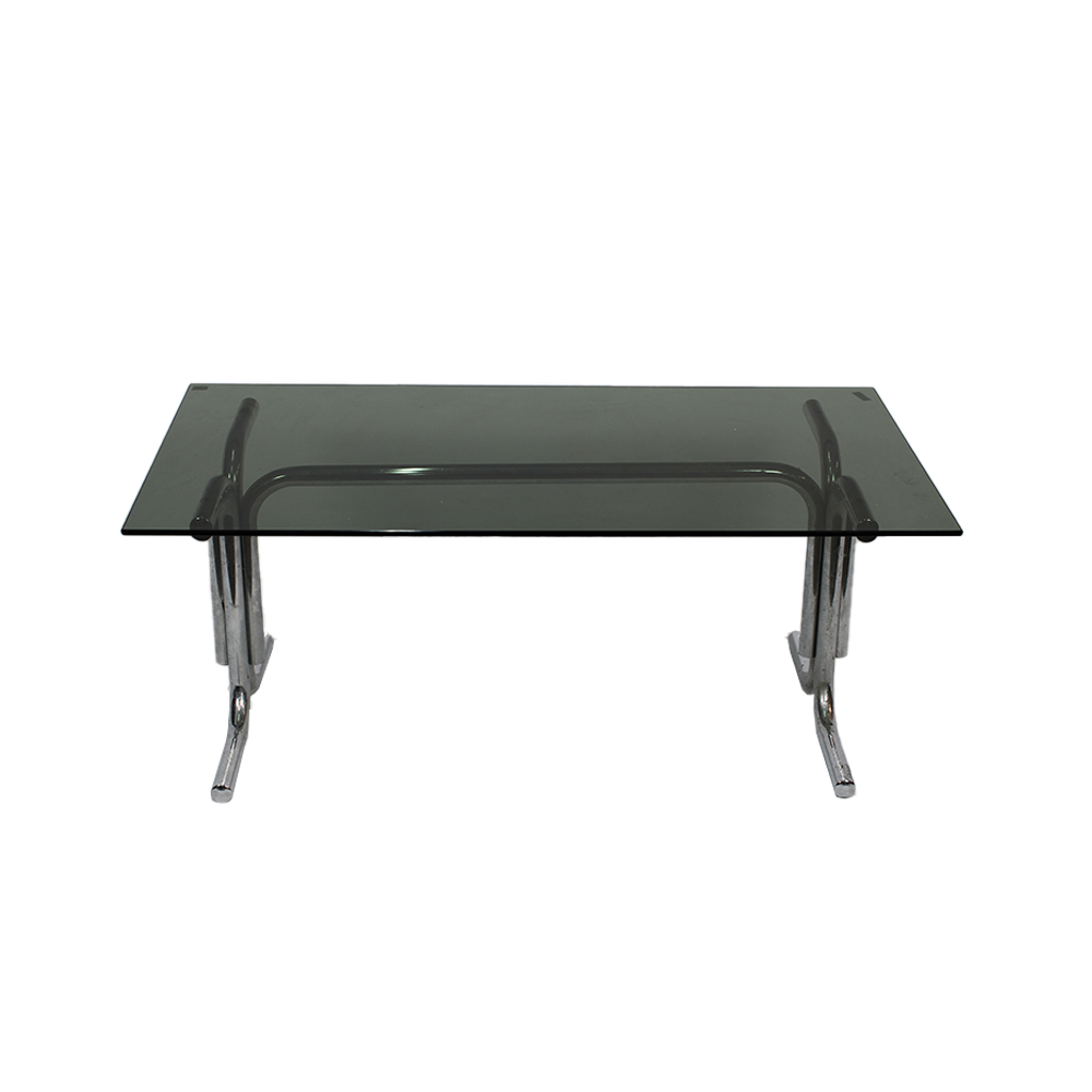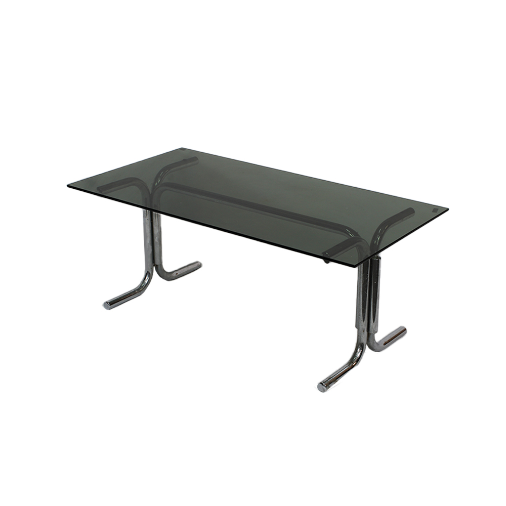 TAVOLINO DA CAFFÈ BASSO in acciaio e vetro fumè degli anni 70 produzione italiana, il tavolino si presenta in buone condizioni ma con normali segni del tempo, ottimo complemento d'arredo. h cm 40 x 100 x 52