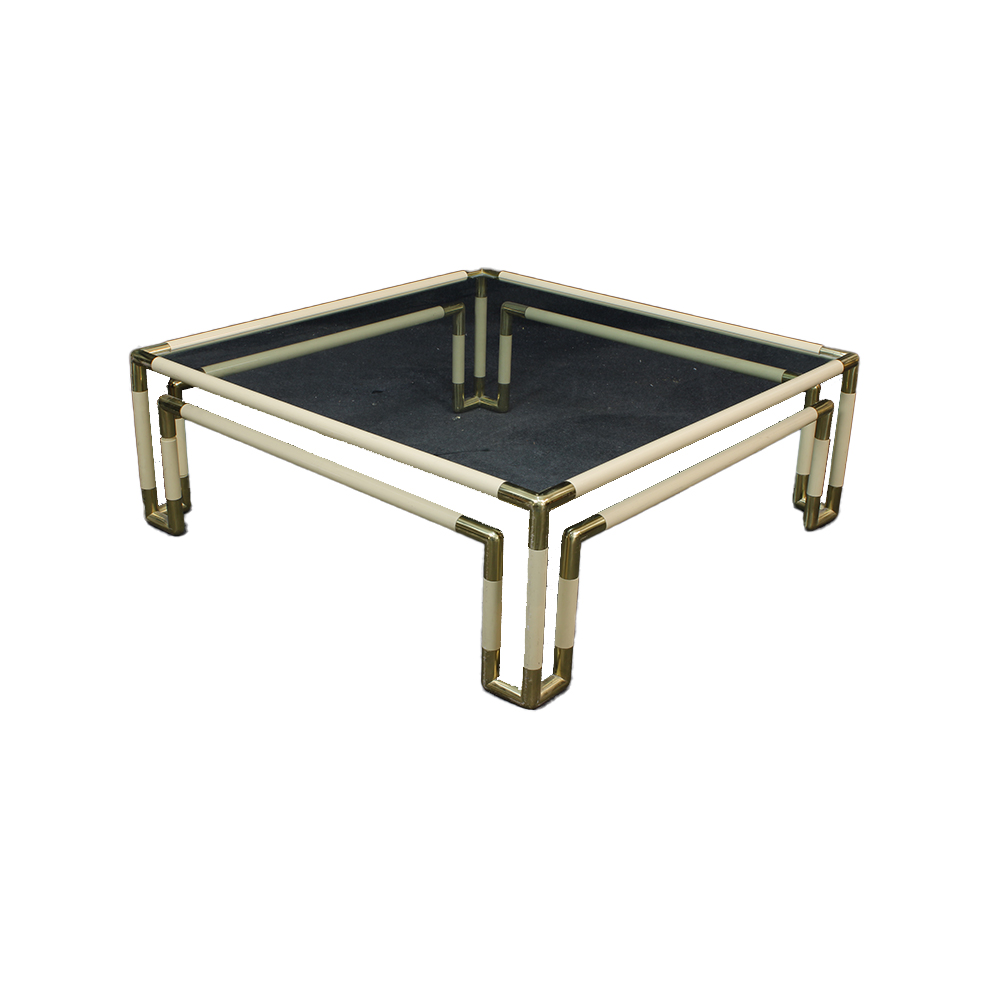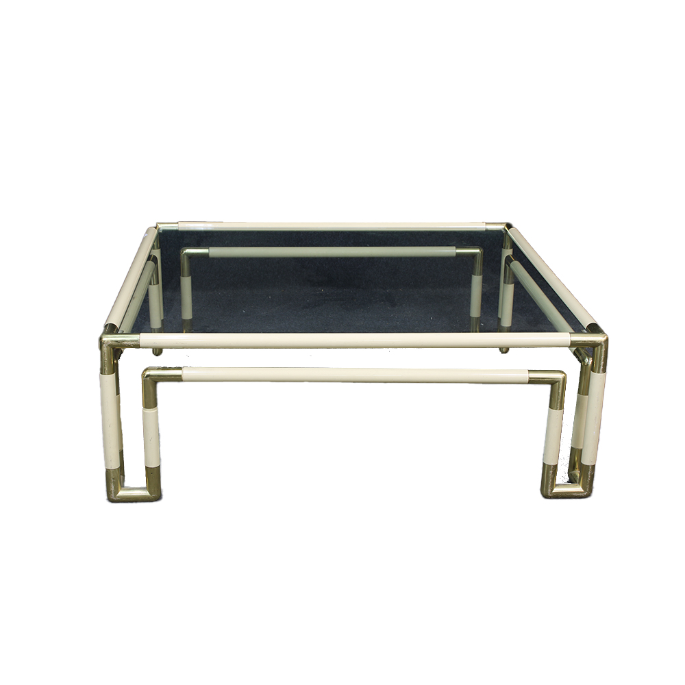 TAVOLINO BASSO MODERNO con struttura in metallo cromato a sezione tubolare, parzialmente rivestita in materiale plastico di colore bianco. Piano superiore in vetro trasparente. Design minimale. h cm 35 x 100 x 100