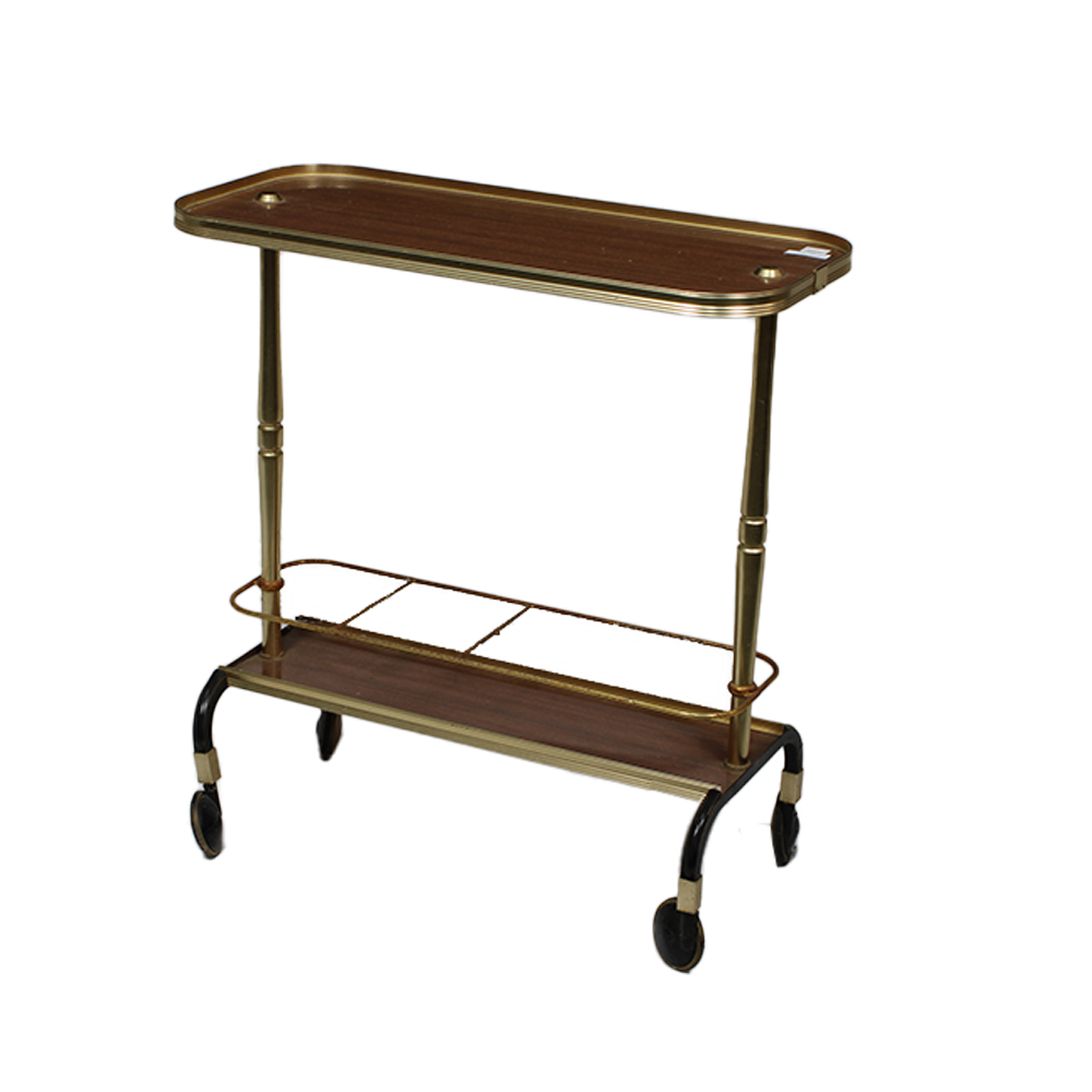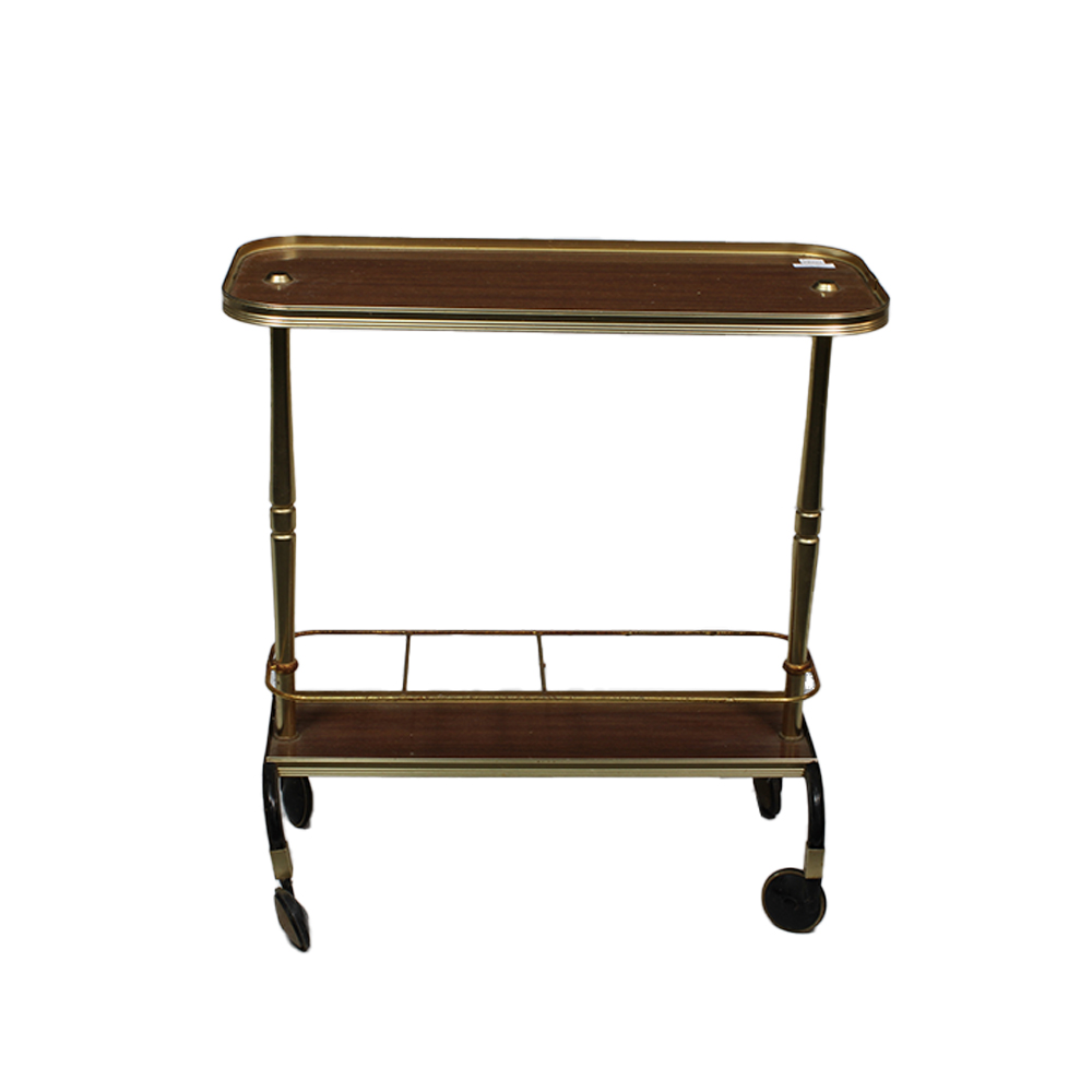 CARRELLINO DI SERVIZIO VINTAGE in metallo dorato con ripiani in legno impiallacciato, piano superiore con bordo sagomato e ripiano inferiore dotato di ringhiera perimetrale. Struttura su colonnine tornite, completo di quattro ruote pivottanti. Produzione italiana probabilmente anni 50-60, normali segni d'uso h cm 60 x 56 x 25