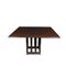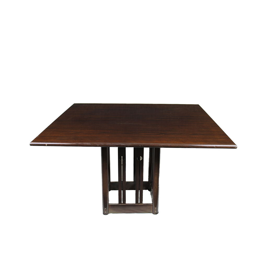 GRANDE TAVOLO ANNI 70 in legno massello tinto scuro con piano quadrato e base centrale a montanti verticali traforati di ottima fattura in buone condizioni generali con lievi segni d'uso. Produzione italiana h cm 74 x 130 x 130