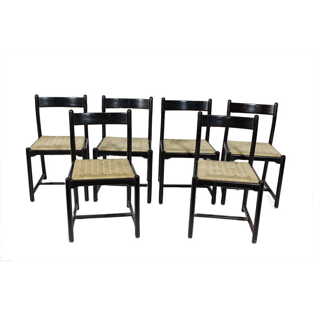 SET DI 6 SEDIE in legno per la struttura e corda per la seduta, il set si presenta in buone condizioni produzione italiana periodo stimato anni 60 h cm 76 x 46 x 43
