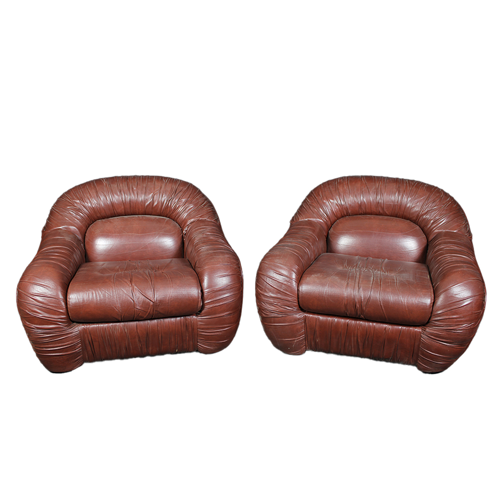 COPPIA POLTRONE MODELLO "CAPRICCIO" in pelle/eco-pelle color marrone, dalle forme tondeggianti e imbottitura avvolgente. Tipiche degli anni 70 , in buone condizioni generali con normali segni del tempo. Produzione italiana h cm 76 x 101 x 105