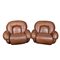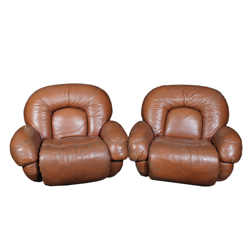 COPPIA POLTRONE SPACE AGE ANNI 60 in pelle marrone dalle linee bombate e avvolgenti con imbottiture generose tipiche del design futuristico dell'epoca. In ottime condizioni generali, con normali segni del tempo. Produzione italiana h cm 82 x 103 x 90