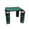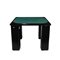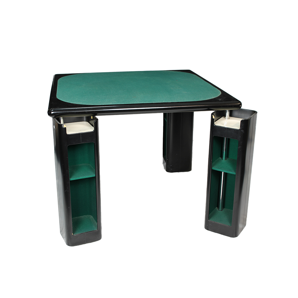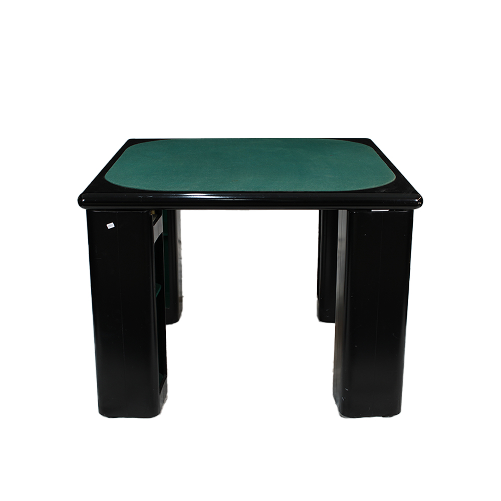 TAVOLO DA GIOCO QUADRATO rivestito in panno verde, struttura in legno laccato nero con angoli stondati; quattro gambe a sezione piena arrotondata, ciascuna dotata di vani a giorno porta-fiche/porta-oggetti rivestiti internamente in panno. Linea essenziale ed elegante, tipica dei tavoli da gioco domestici del dopoguerra; design italiano, anni 1950–1960 circa. h cm 77 x 103 x 103