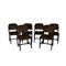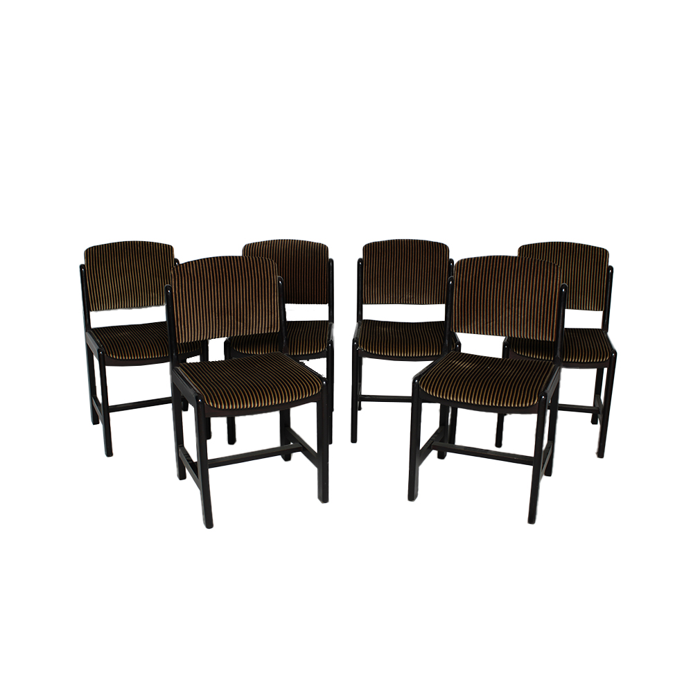 SET DI SEI SEDIE IMBOTTITE struttura in legno laccato scuro con schienale rettangolare leggermente avvolgente; seduta e schienale rivestiti in velluto a righe verticali nei toni marrone–nero. Gambe dritte con traverse di irrigidimento inferiori. Elegante linea anni ’60 idonea sia a tavolo da pranzo sia a tavolo da gioco; design italiano, anni 1960–1970 circa. h cm 83 x 46 x 45