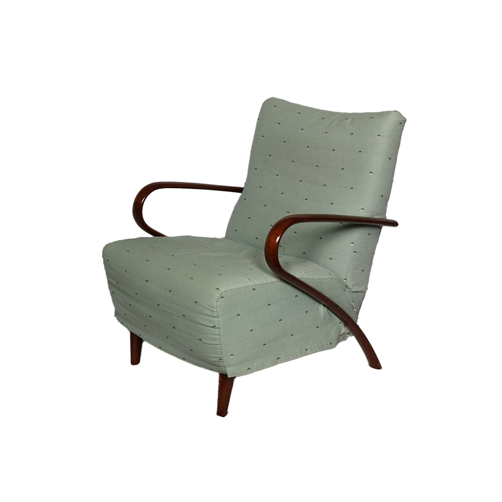 POLTRONA IMBOTTITA con braccioli in legno curvato a sezione arrotondata, struttura in legno e rivestimento in tessuto chiaro con piccoli motivi puntiformi. Linea sinuosa ed elegante tipica del modernariato. Design italiano, anni 1950-1960 circa h cm 88 x 70 x 72