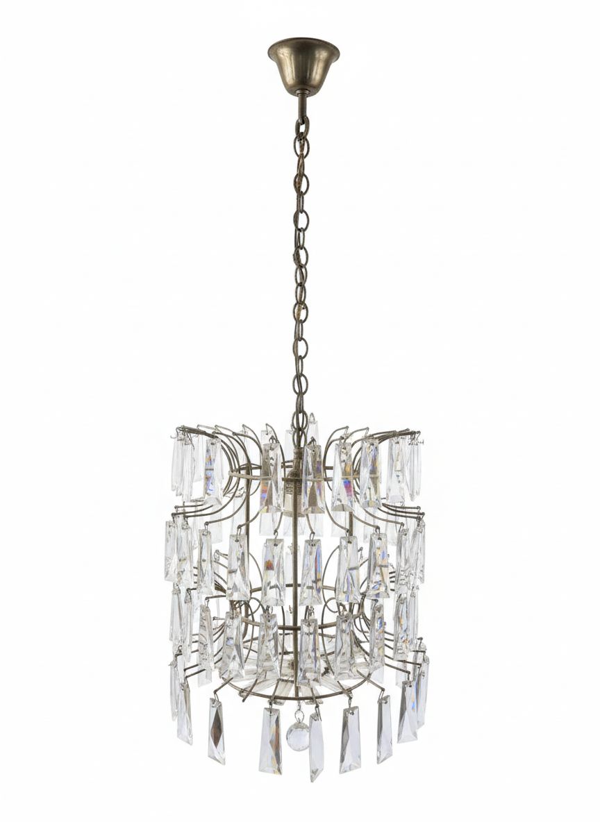 LAMPADARIO a gocce di cristallo a struttura metallica con pendagli prismati disposti su più ordini; impianto elettrico da verificare e mancanze.