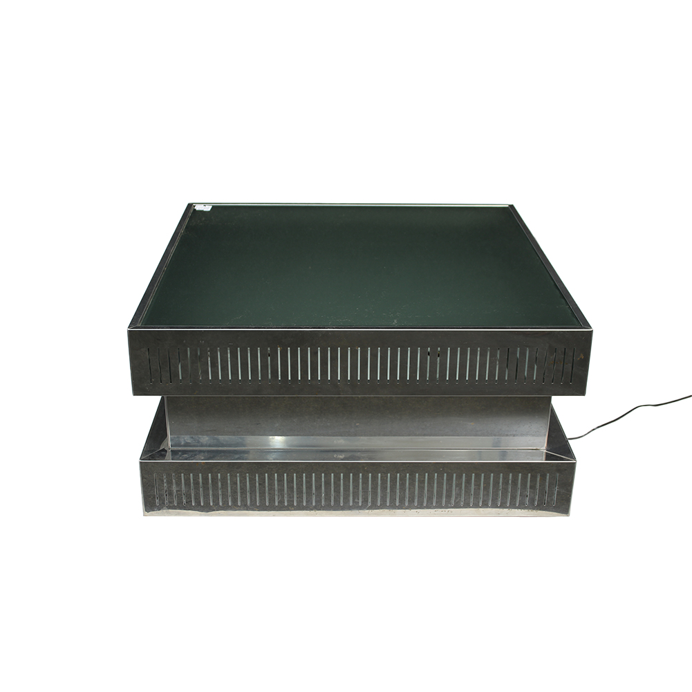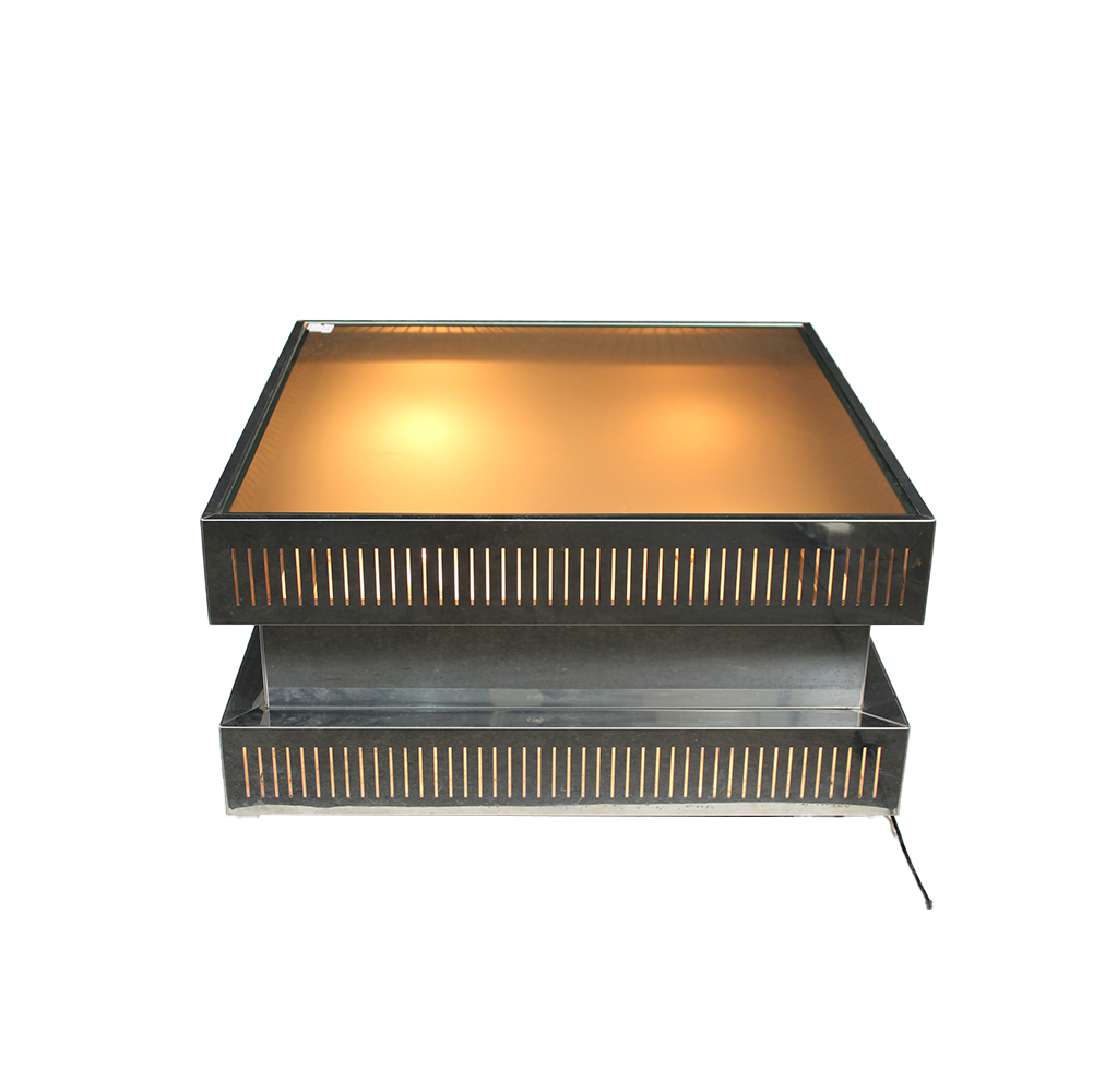 GRANDE TAVOLINO DA CAFFÈ LUMINOSO in acciaio per la struttura e vetro per la base produzione italiana periodo stimato anni 70 h cm 41 x 75 x 75
