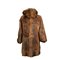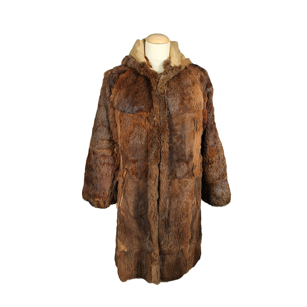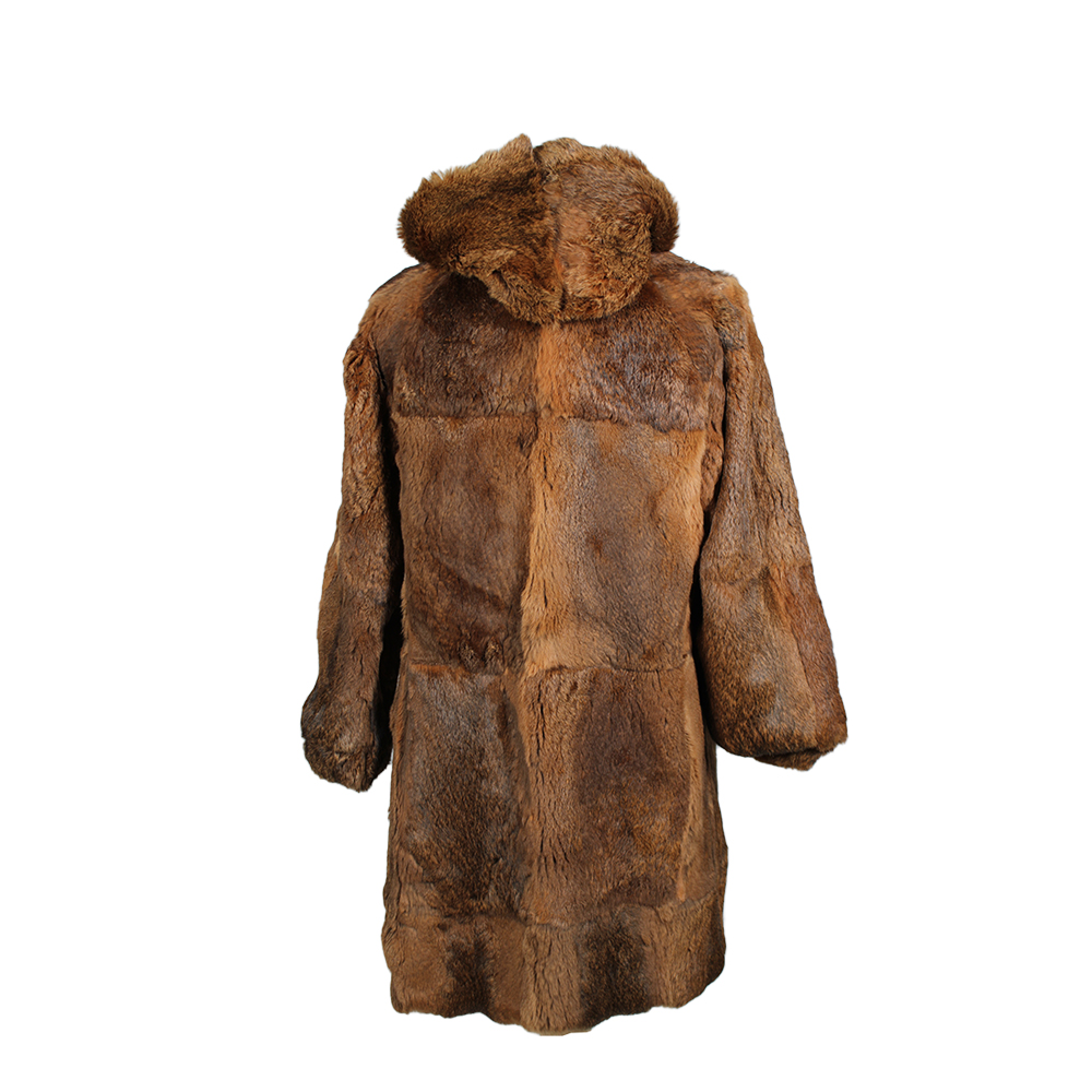 CAPPOTTO LUNGO IN VERA PELLICCIA DI CONIGLIO di tonalità marrone con sfumature naturali; modello femminile con ampio cappuccio e chiusura con lacci e ganci interni. Linea morbida e avvolgente, maniche lunghe. Italia, seconda metà del XX secolo. Normali segni d’uso, qualche zona leggermente usurata.