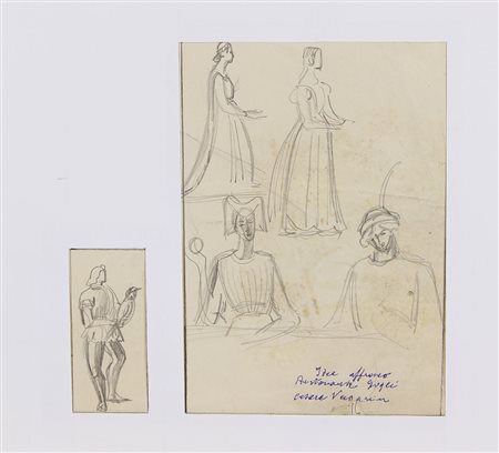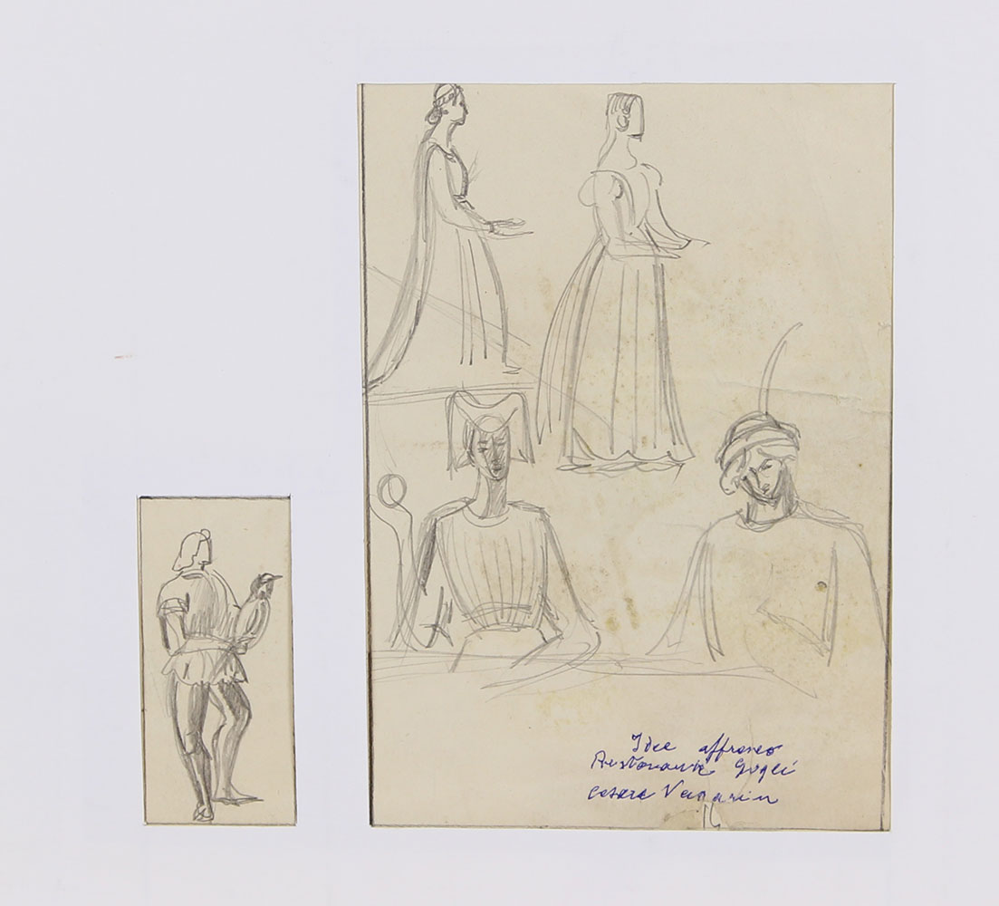 Vagarini Cesare Idea Affresco Ristorante Gogli matita su carta, cm. 24,5x23,5 firmato e intitolato in basso a destra, l'opera presenta alcuni strappi e una piccola mancanza in basso al centro senza cornice
