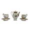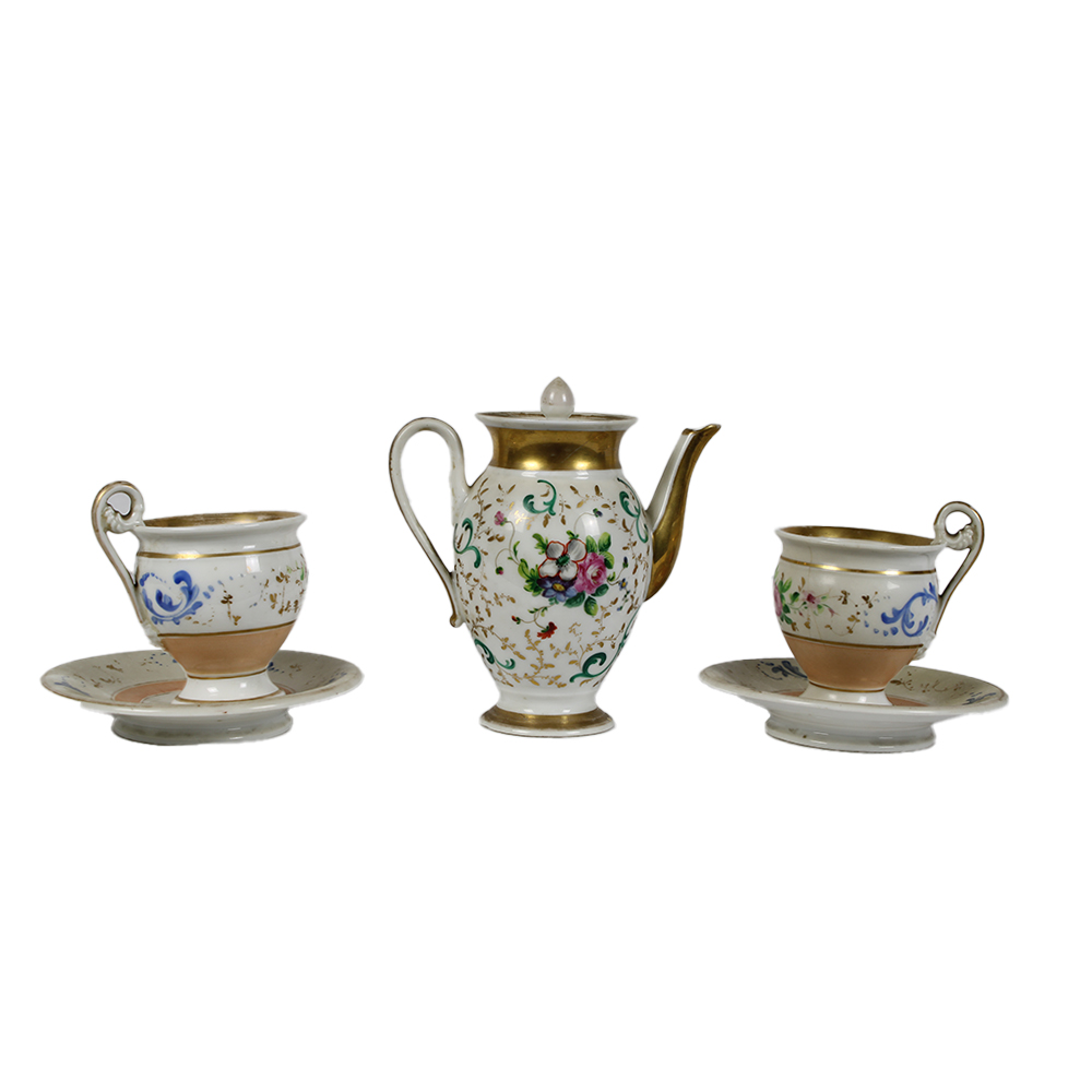 SERVIZIO TETE A TETE composto da una caffettiera e due tazzine con piattino in porcellana dipinta a motivi floreali e lumeggiature in oro Francia XIX secolo misure varie