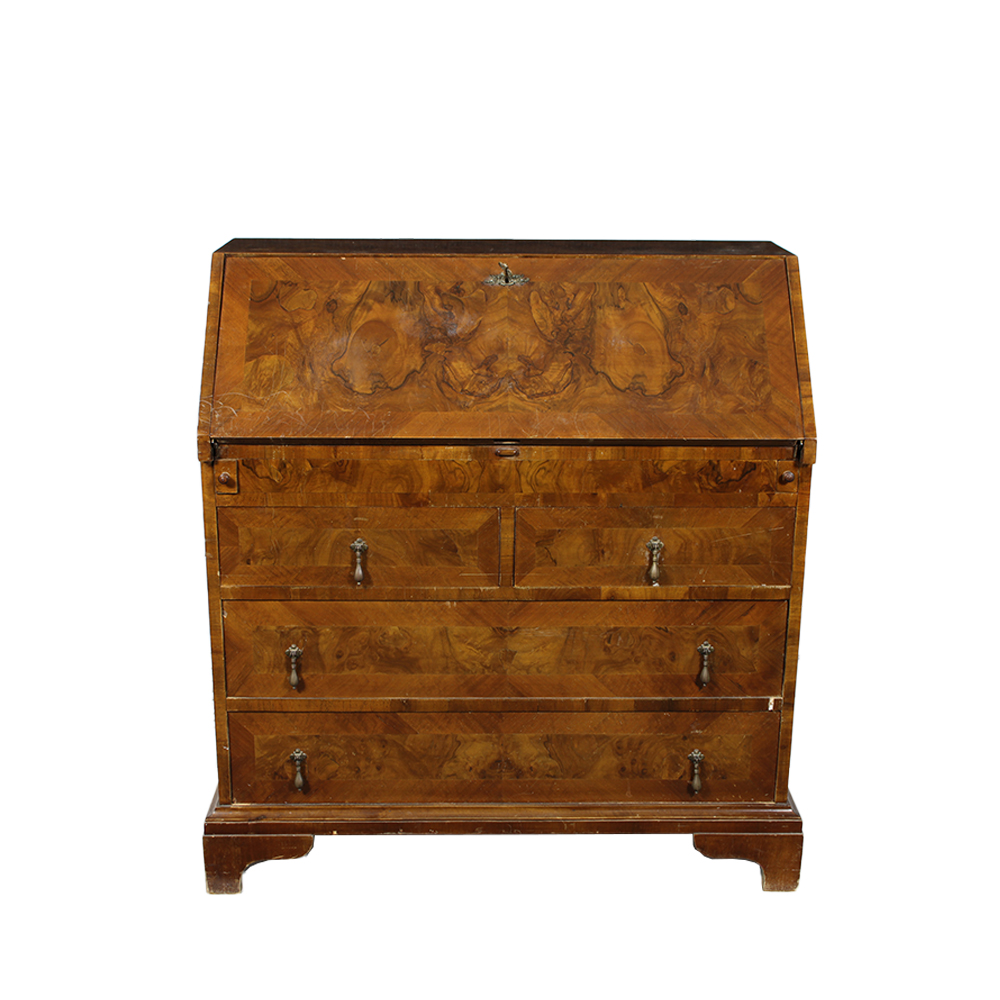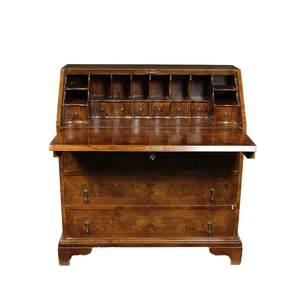 RIBALTA DI GUSTO SETTECENTESCO in noce e radica di noce con anta a ribalta contenente scarabattolo, 2 cassetti più piccoli nella parte superiore e due cassetti più grandi nella parte inferiore Italia primi 900 h cm 103 x 97 x 46