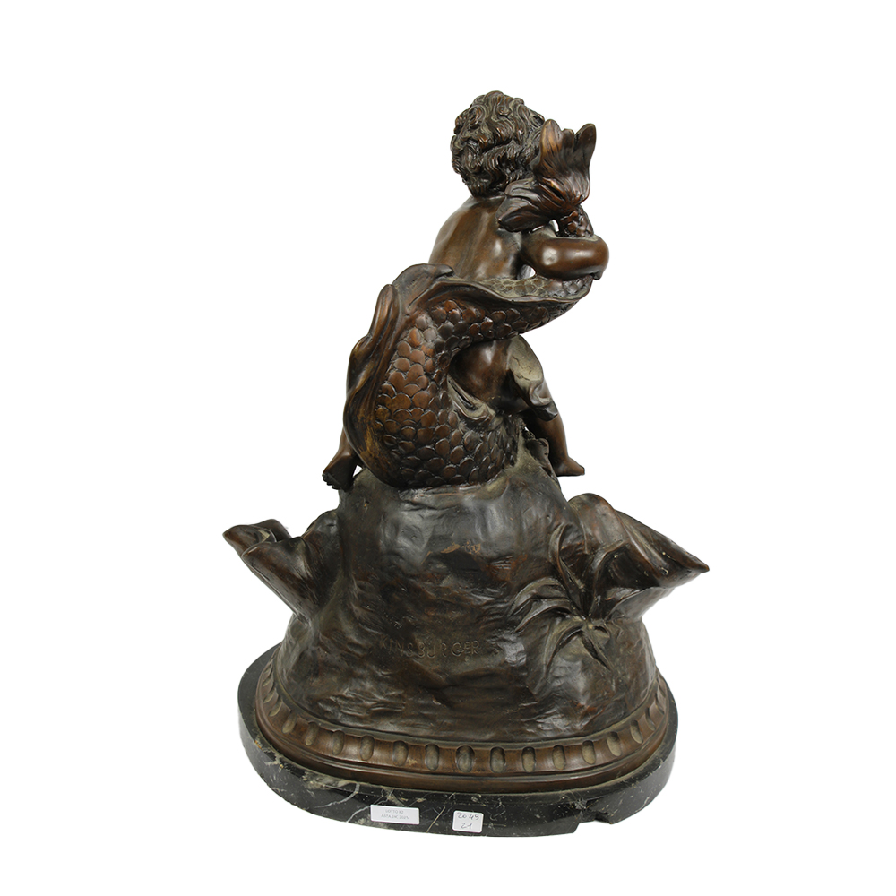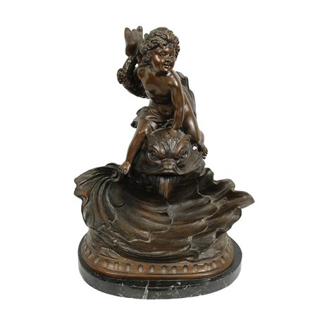 GRUPPO SCULTOREO in bronzo raffigurante fontana con putto base in marmo nero, sbeccature, fonderie italiane primi 900 h cm 55 x 35 x 30