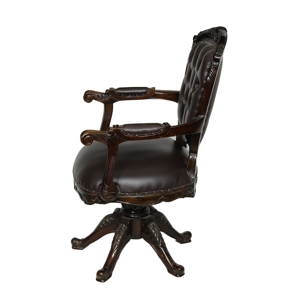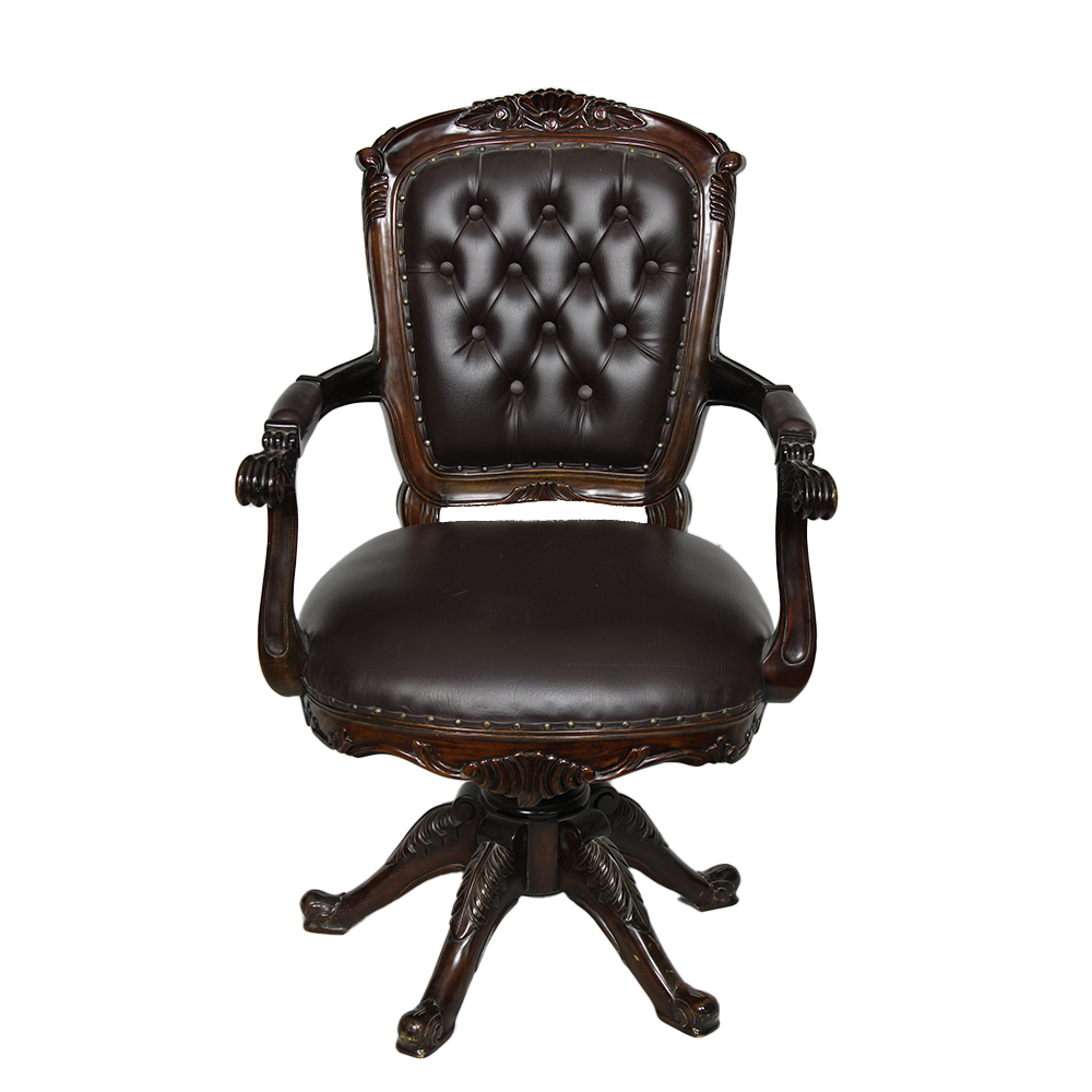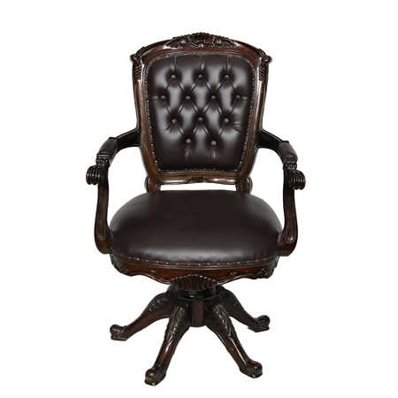 POLTRONA DA SCRIVANIA GIREVOLE in legno di mogano con seduta e spalliera imbottita in pelle XX secolo h cm 101 x 62 x 60