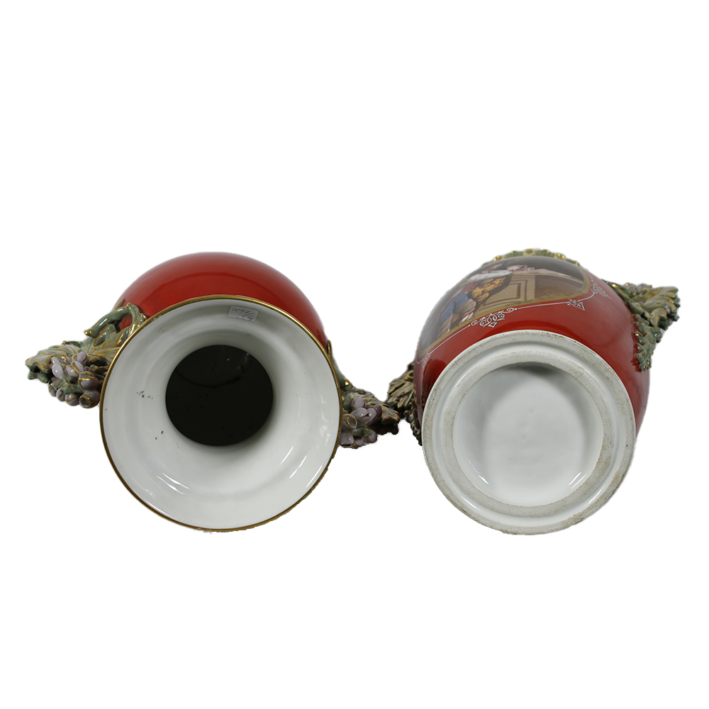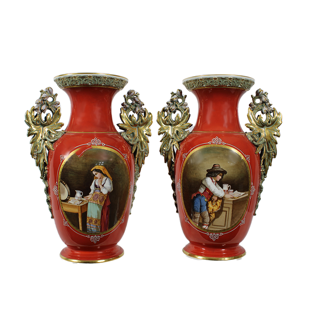 COPPIA DI VASI LUIGI FILIPPO in porcellana dipinta dentro riserve raffigurante personaggi con lumeggiature in oro, con incollaggio e sbeccature in un manico Francia XIX secolo h cm 46 x 33 x 21