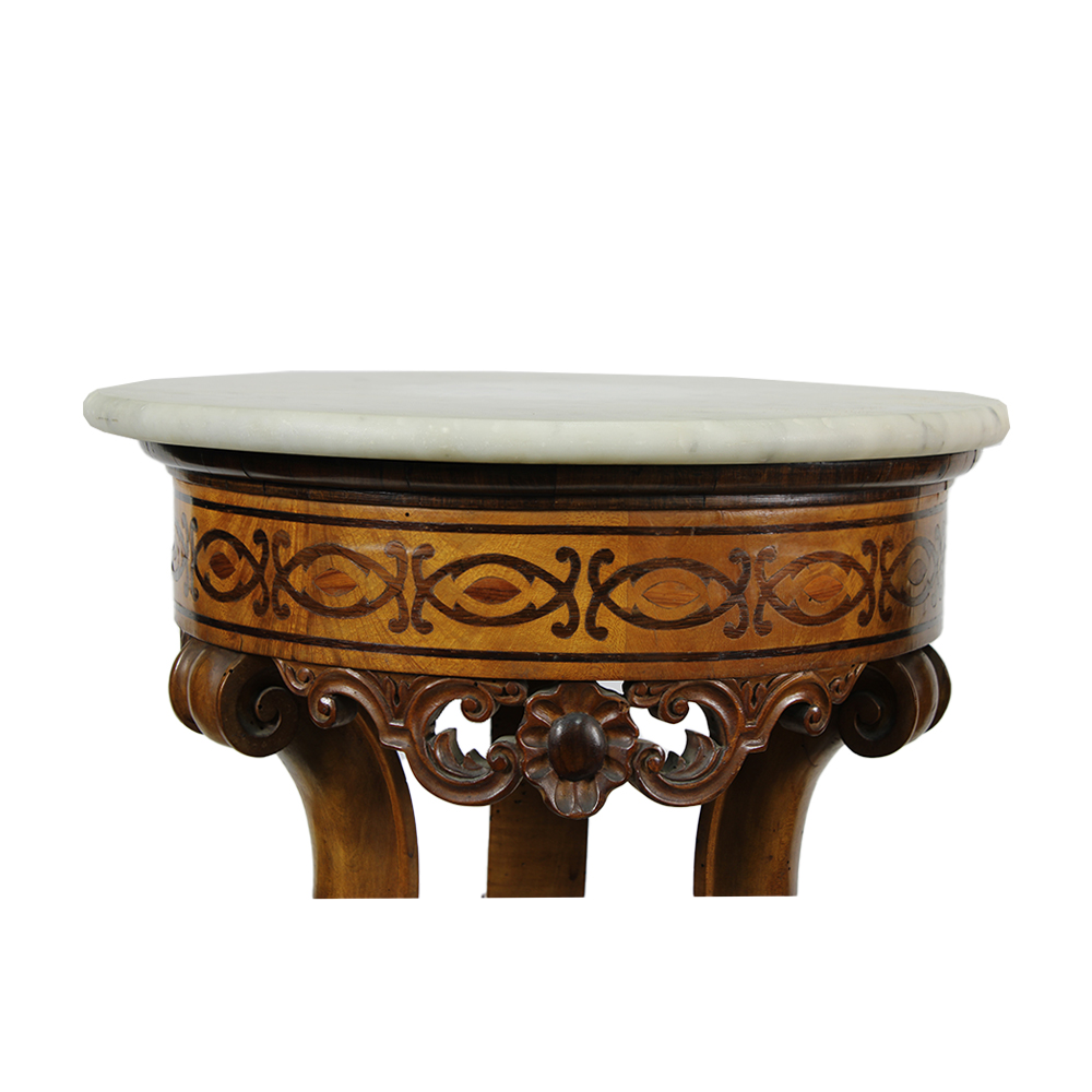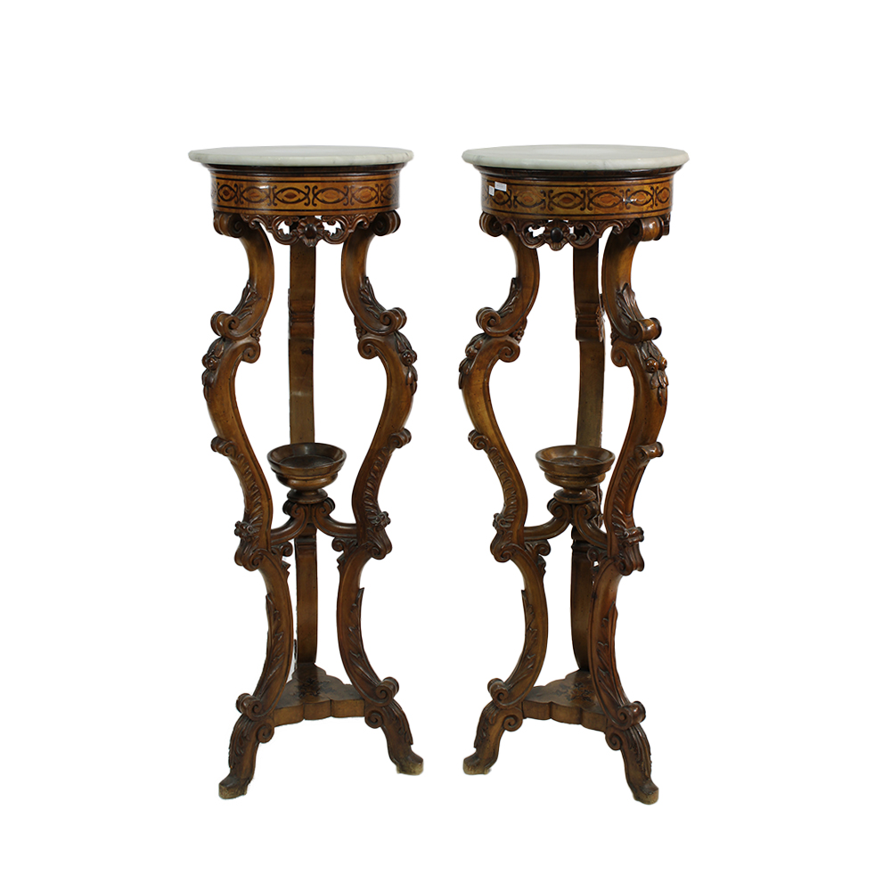 COPPIA TRESPOLI CARLO X in legno di noce con tarsie in palissandro e legno rosa piano in marmo bianco di Carrara Sicilia XIX secolo h cm 140 x 40 x 40