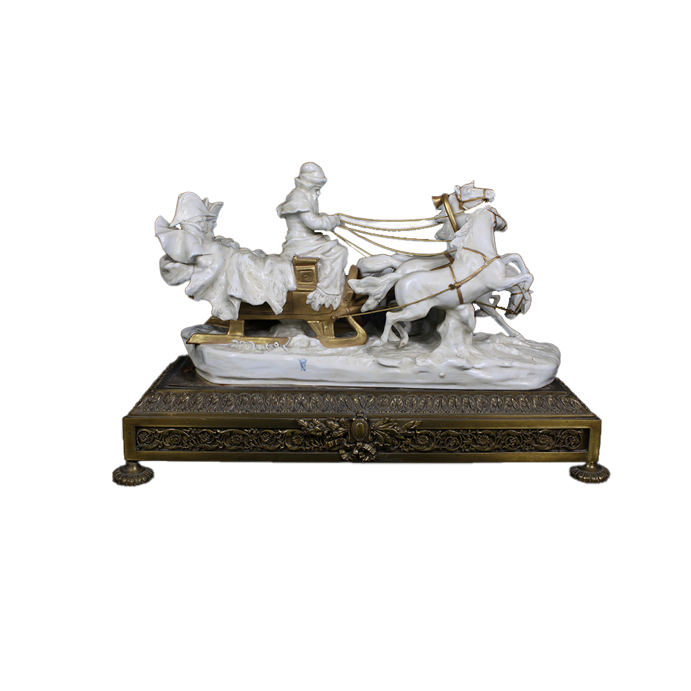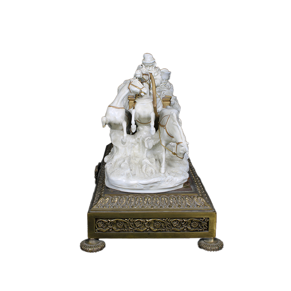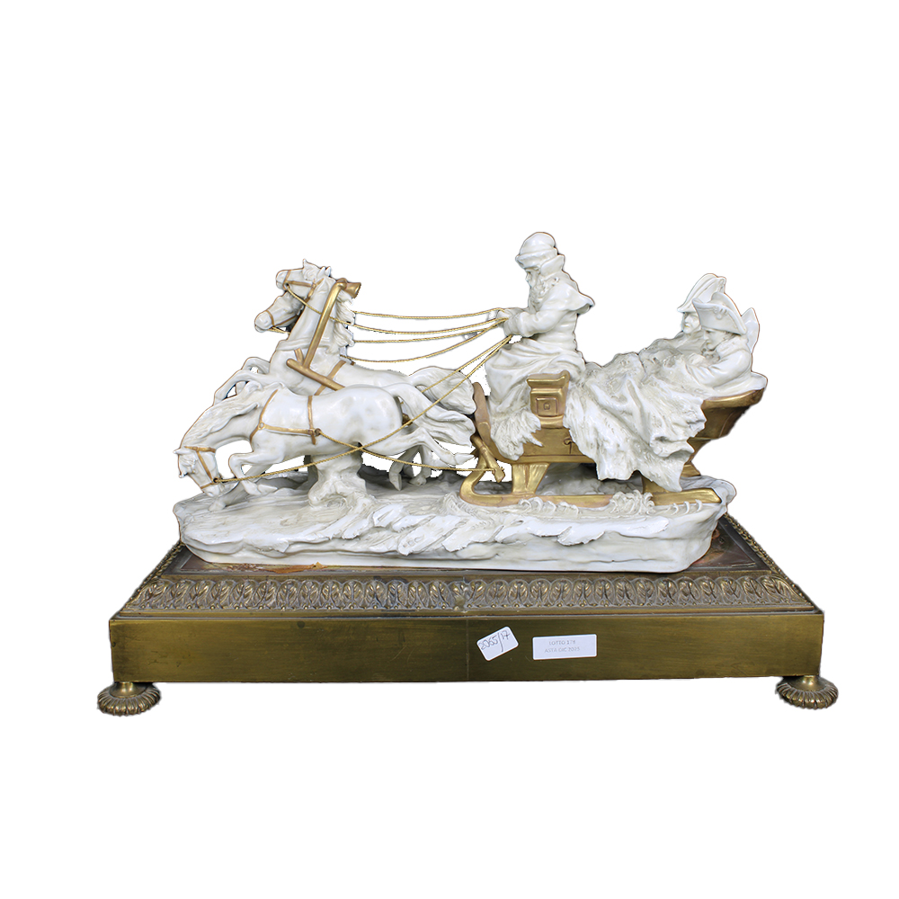 GRUPPO SCULTOREO raffigurante cavalli con slitta Napoleone in viaggio, base in metallo finemente cesellato e dorato manifattura Capodimonte prima metà XX secolo h cm 30 x 44 x 20