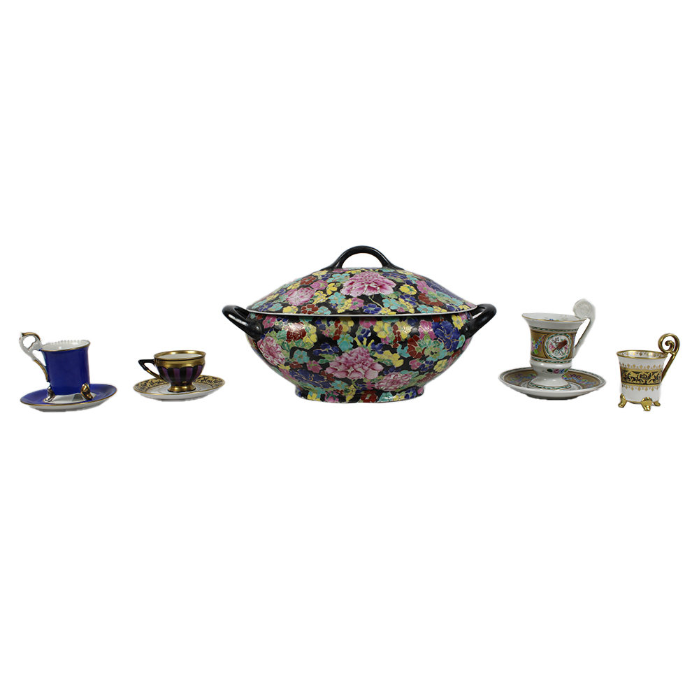 LOTTO COMPOSTO DA 1 zuppiera in porcellana dipinta a motivi floreali e lumeggiature in oro manifattura Orientale e 4 tazzine e 3 piattini in porcellana di diverse manifatture misure varie