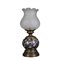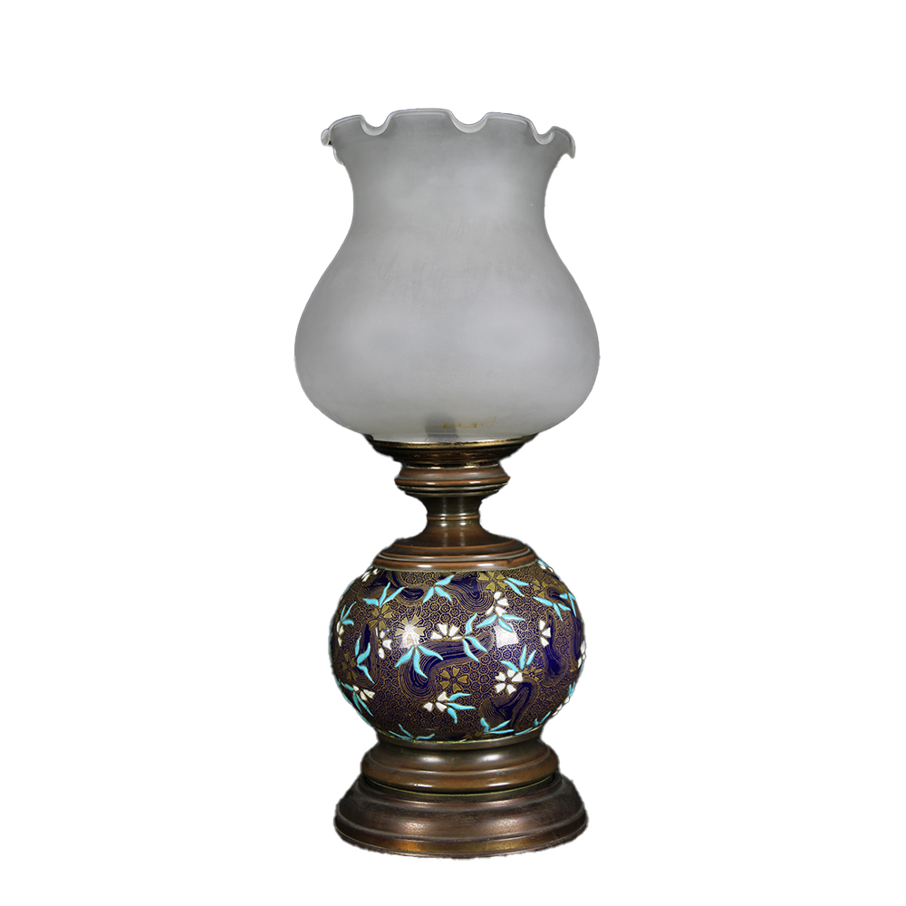 LUME DA TAVOLO con corpo centrale in cloisonne decorato da motivi floreali e rame patinato, boccia in vetro satinato maestranze italiane primi 900 h cm 50 x A 22