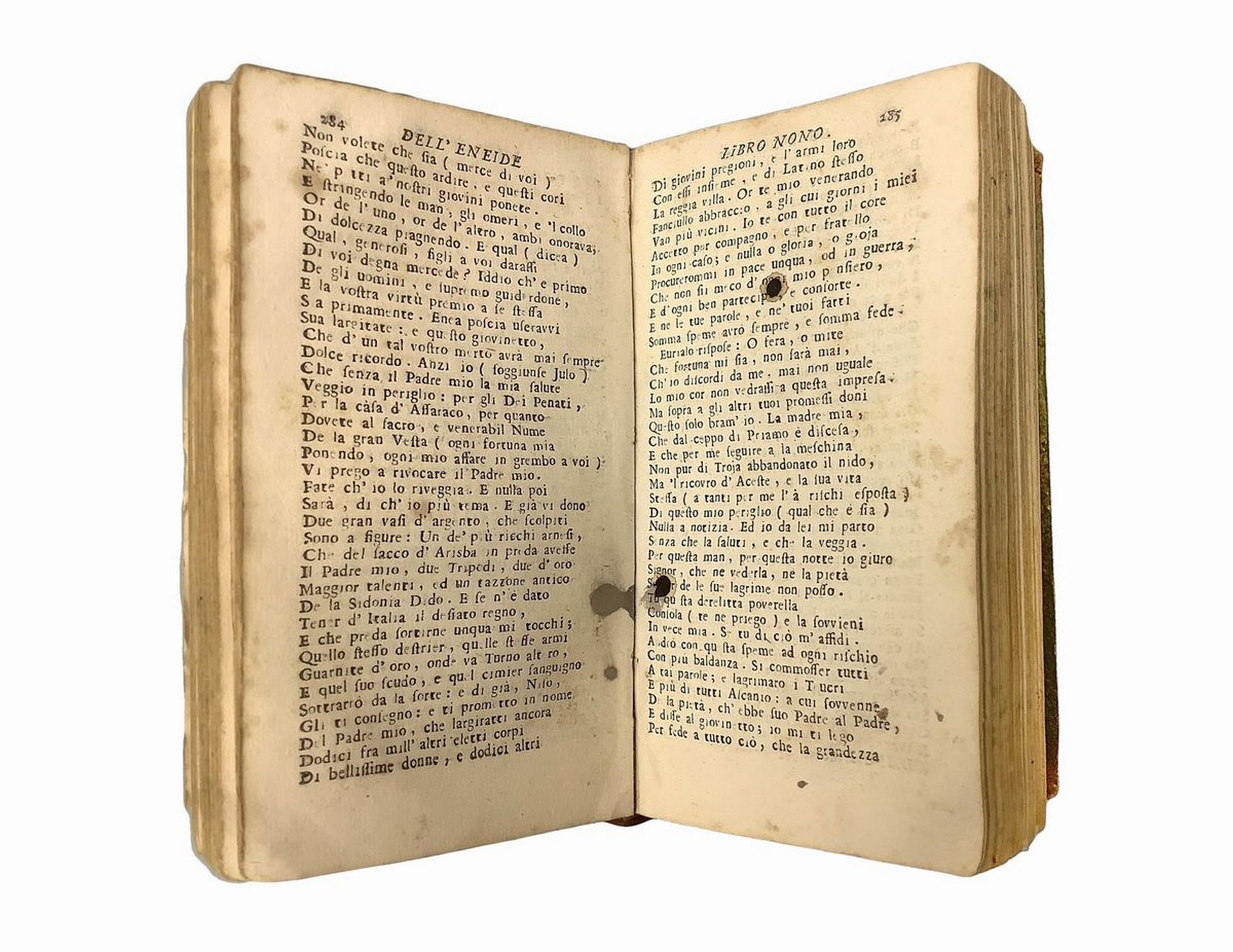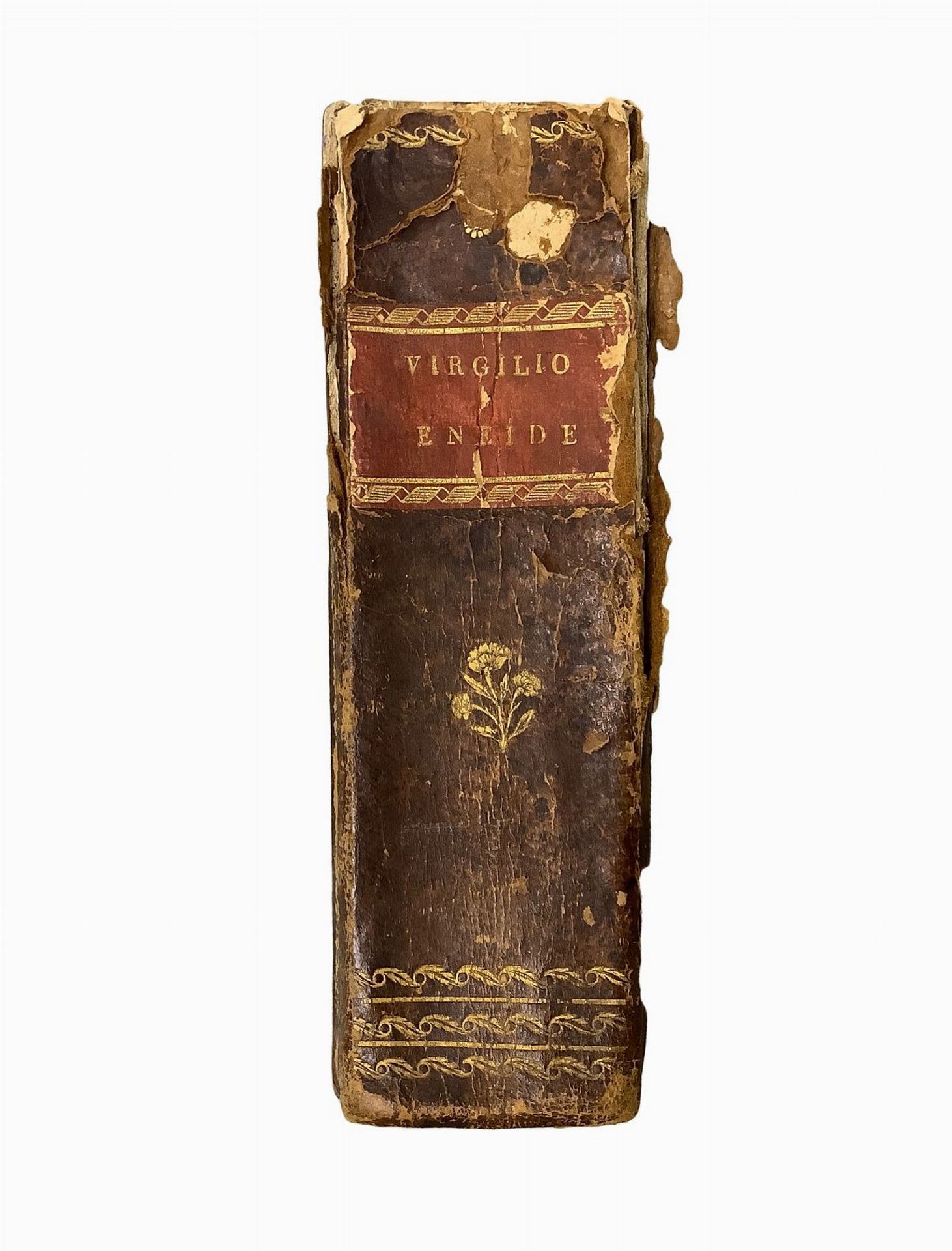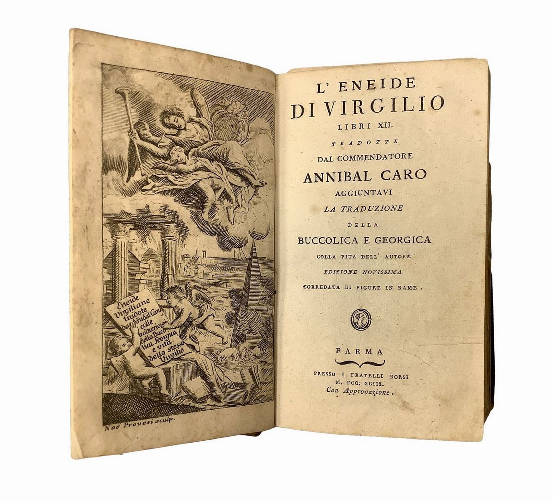 Virgilio - Eneide, opera completa tomo unico comprendente dodici volumi , 1793 H cm 17x9x5 Edizione a cura dei fratelli Borsi di Parma. Opera tradotta e commentata dal commendatore Annibal Caro tra il 1531 e il 1544 insieme alla vita dell'autore e delle Bucoliche e delle Georgiche. Presenti 14 illustrazioni fuori testo.
