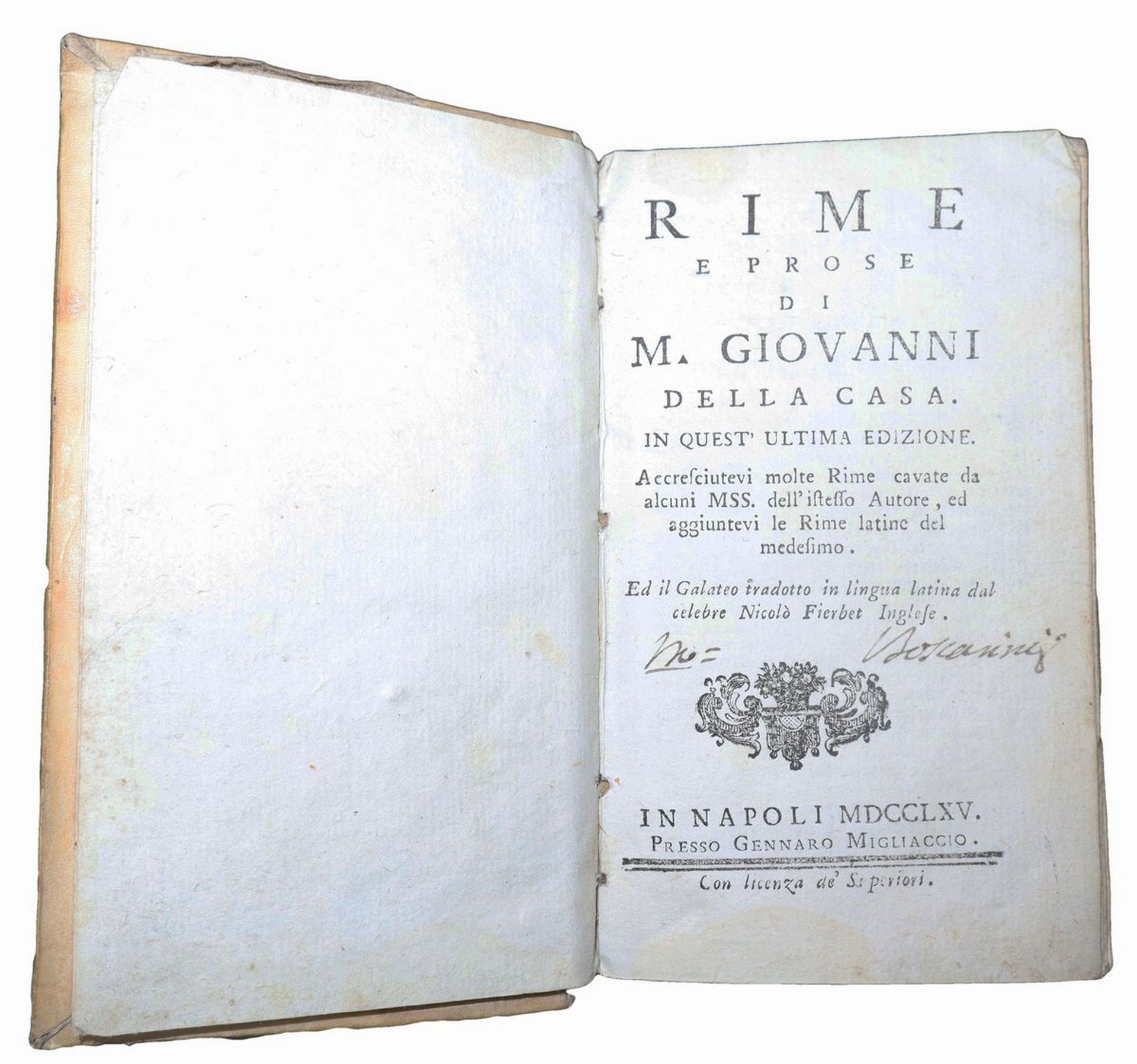 Giovanni Della Casa (Borgo San Lorenzo 1503 - Roma 1556) - Rime e prose di M.Giovanni della Casa, 1765 In Napoli presso Gennaro Migliaccio. Presenti sfilacciature e fioriture