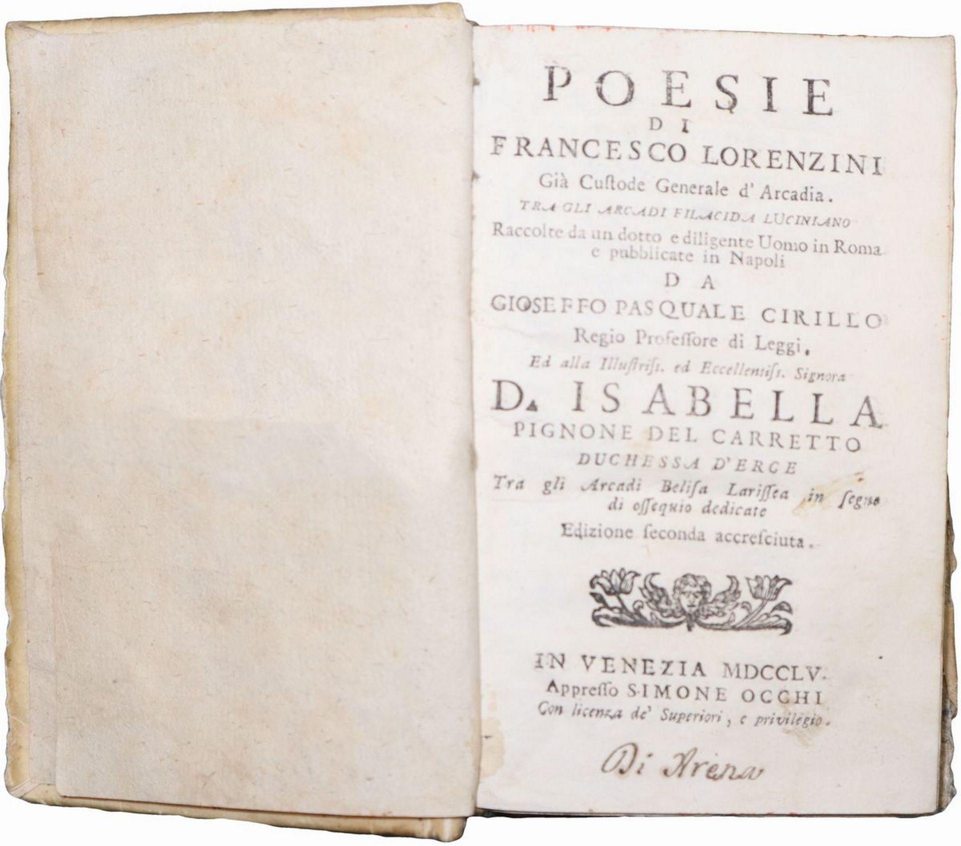 Francesco Maria Lorenzini (Roma 1680 - Roma 1743) - Poesie di Francesco Lorenzini, 1755 Già custode generale d'Arcadia. Tra gli arcadi Filacida Luciniano. Simone Occhi, Venezia. Presenti sfilacciature e fioriture