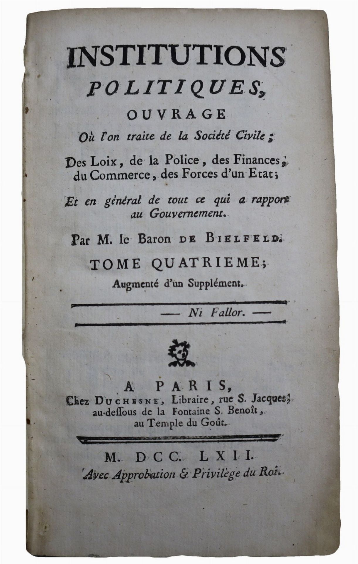 Jakob Friedrich von Bielfeld (1717 - 1770) - Institutions politiques Ouvrage où l'on traite de la Société Civile, 1762 Opera incomplenta, presente tomo IV, Parigi. Fioriture e sfilacciamenti