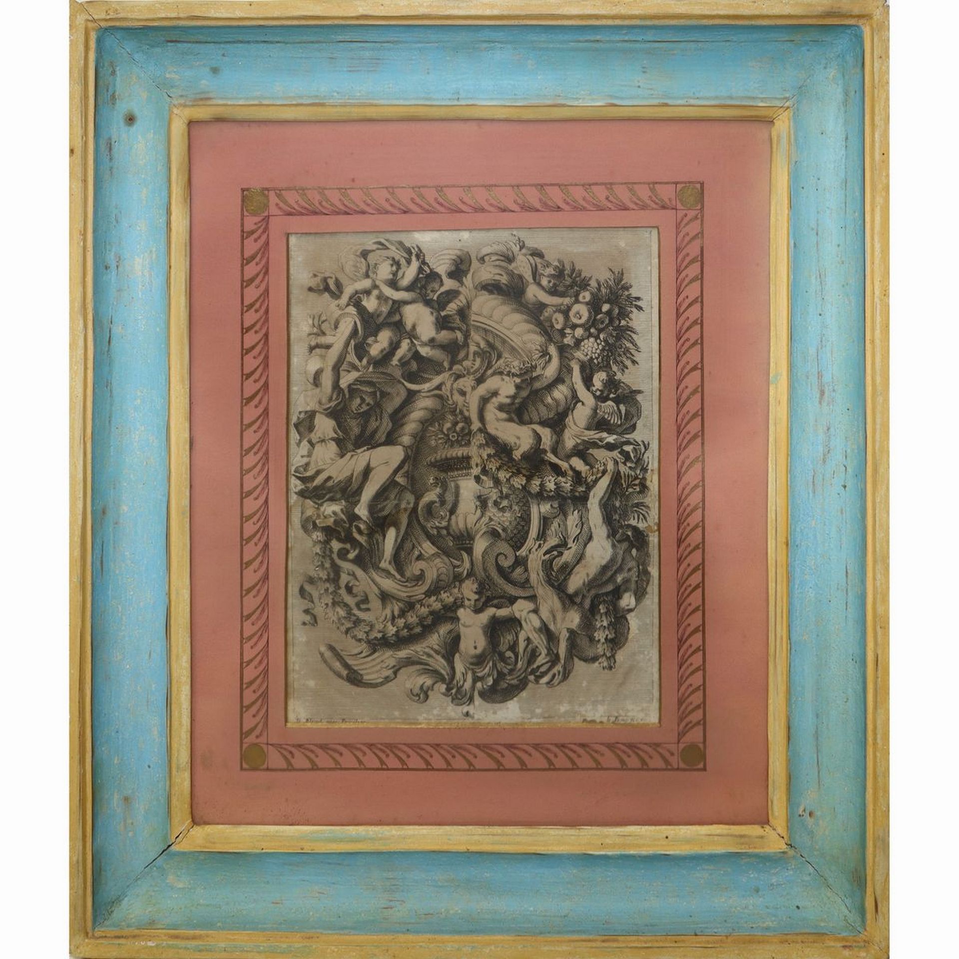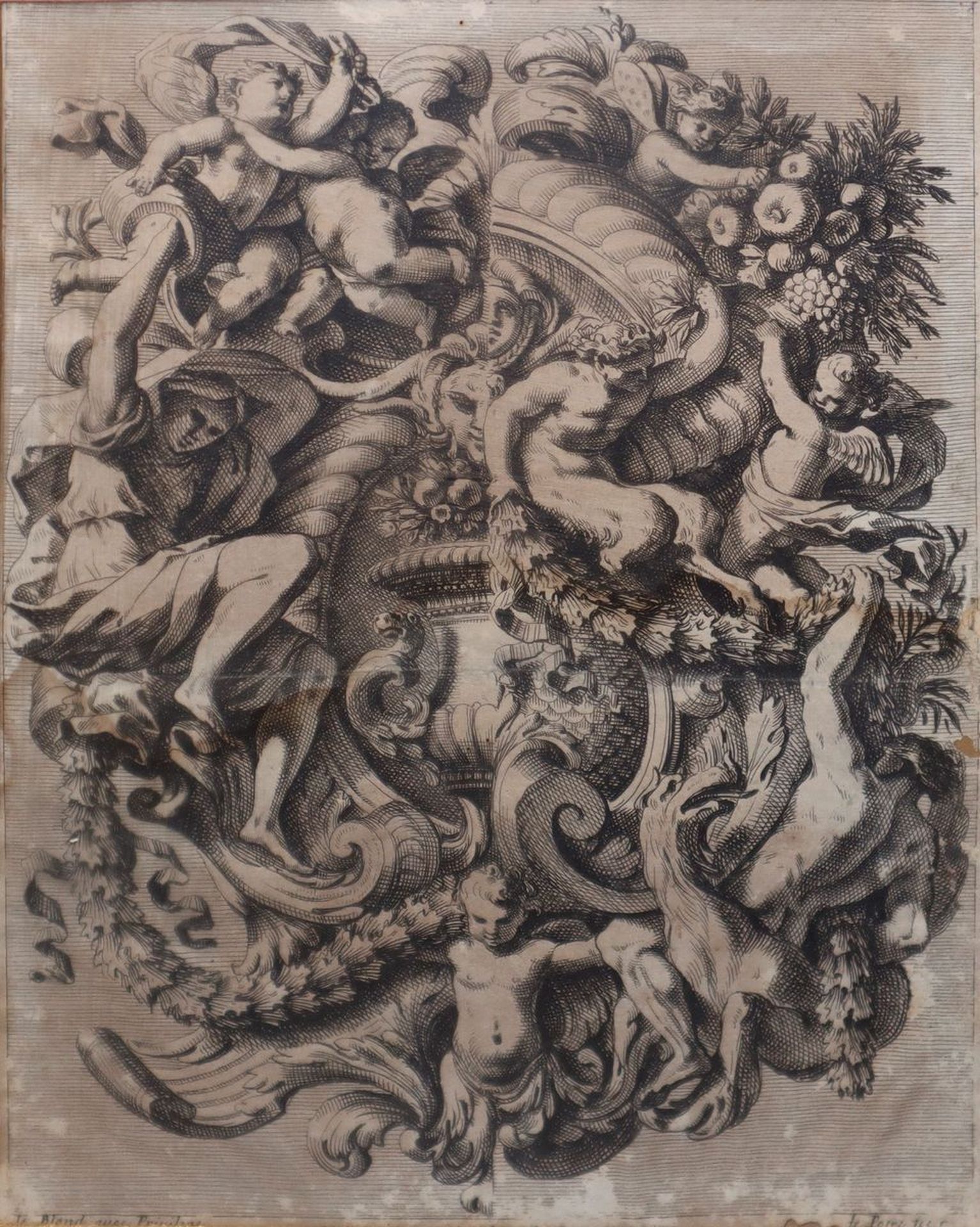 Jean Le Pautre (Parigi 1618 - Parigi 1682) - Putti, fauni e ghirlande di fiori e di frutta in cornice di legno laccato H mm 47 x 60 / in cornice 67 x 80 Incisione all'acquaforte Barocca