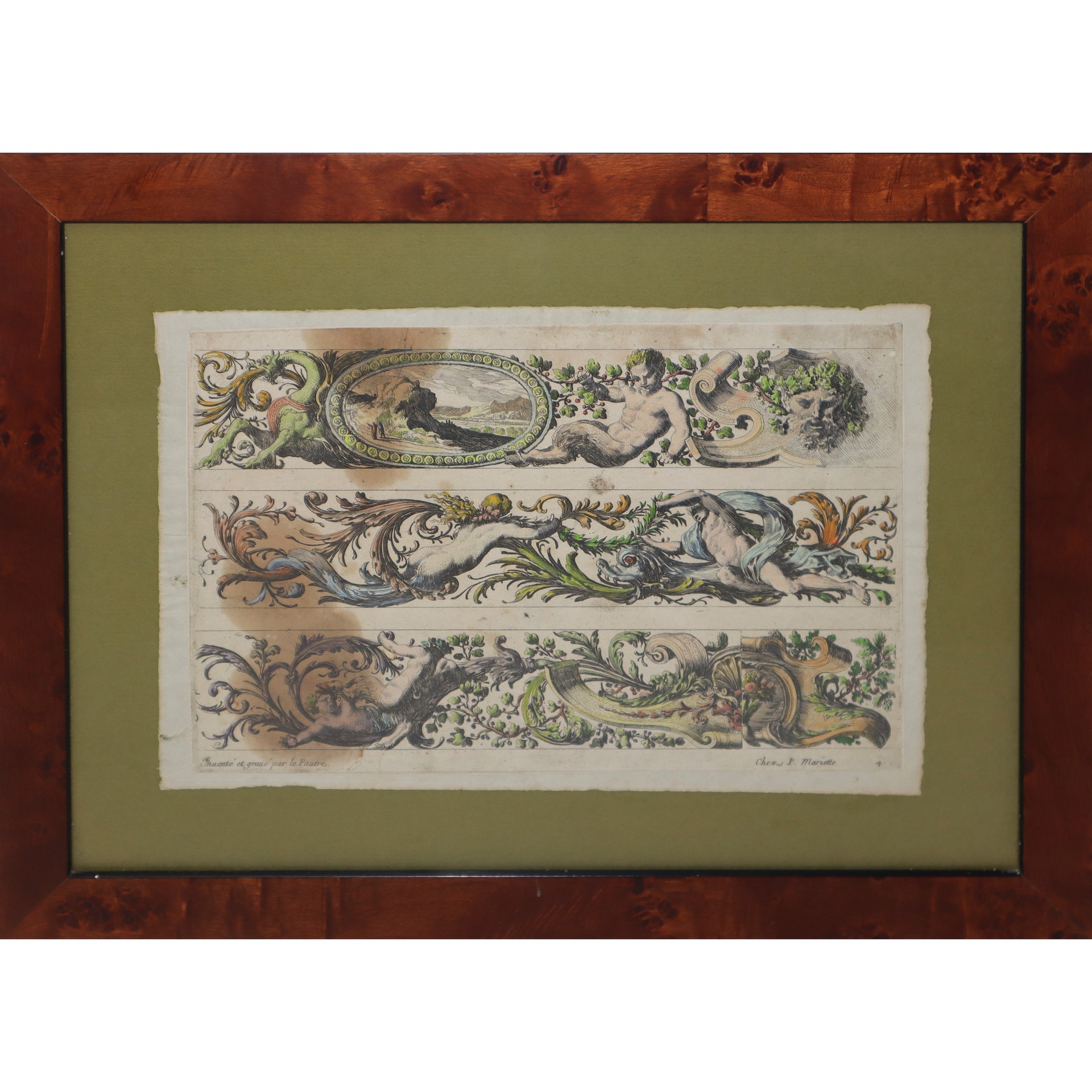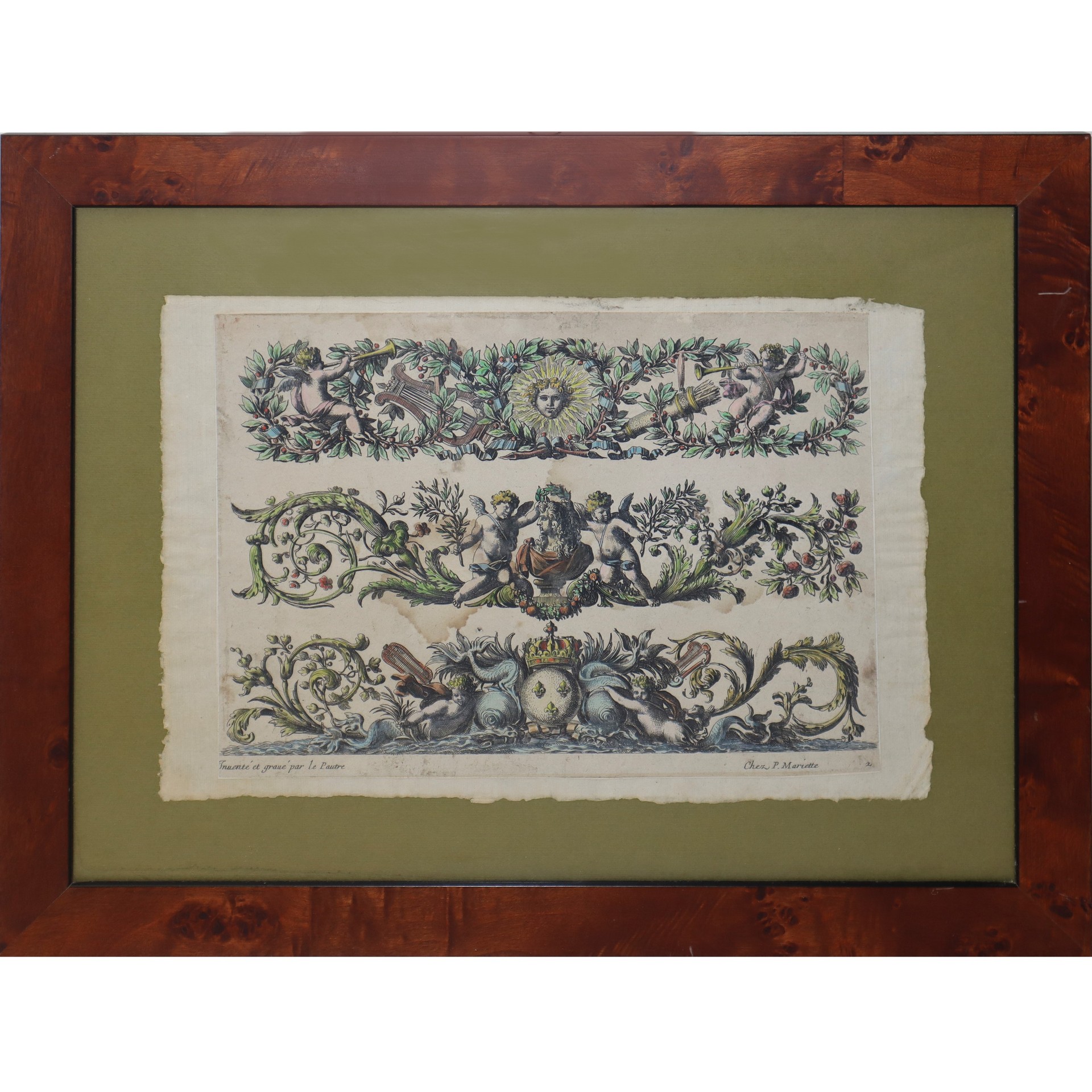 Jean Le Pautre (Parigi 1618 - Parigi 1682) - Coppia di incisioni raffiguranti festoni con Putti, Fiori, Delfini H mm 209 x 308 - 209 x 306 / in cornice cm 34 x 44 Incisione all'acquaforte acquerellata