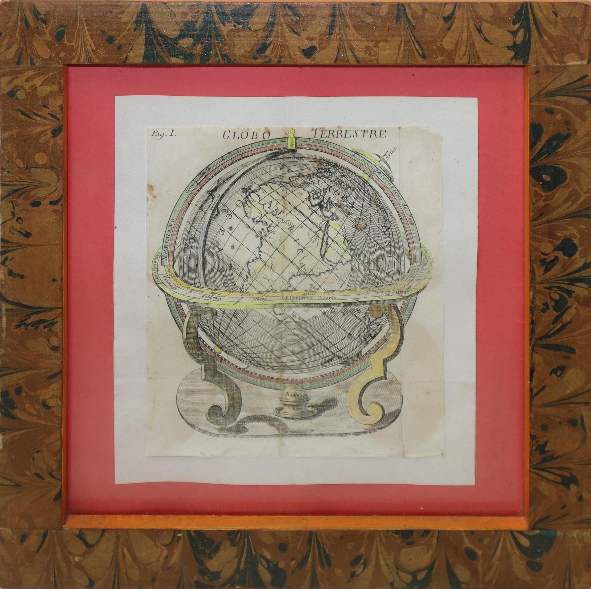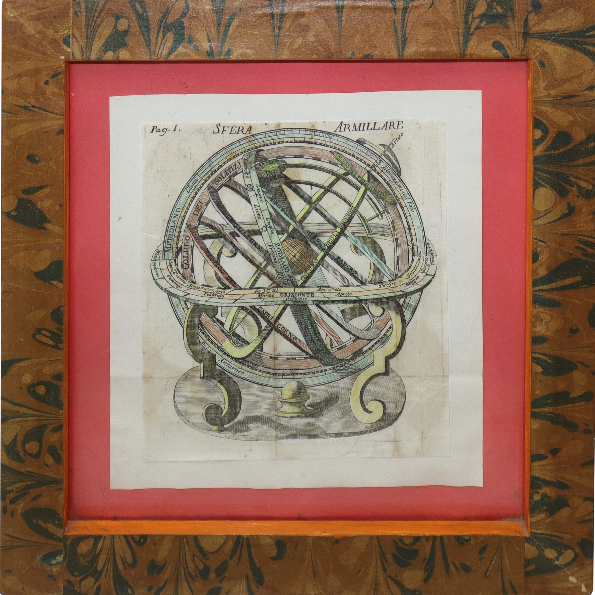 Coppia di incisioni raffiguranti globo terrestre e sfera armillare, 1772 MM 175 x 148 in cornice 30 x 29, MM 172 x 150 in cornice CM 30 x 29 Incisione acquarellate all'acquaforte