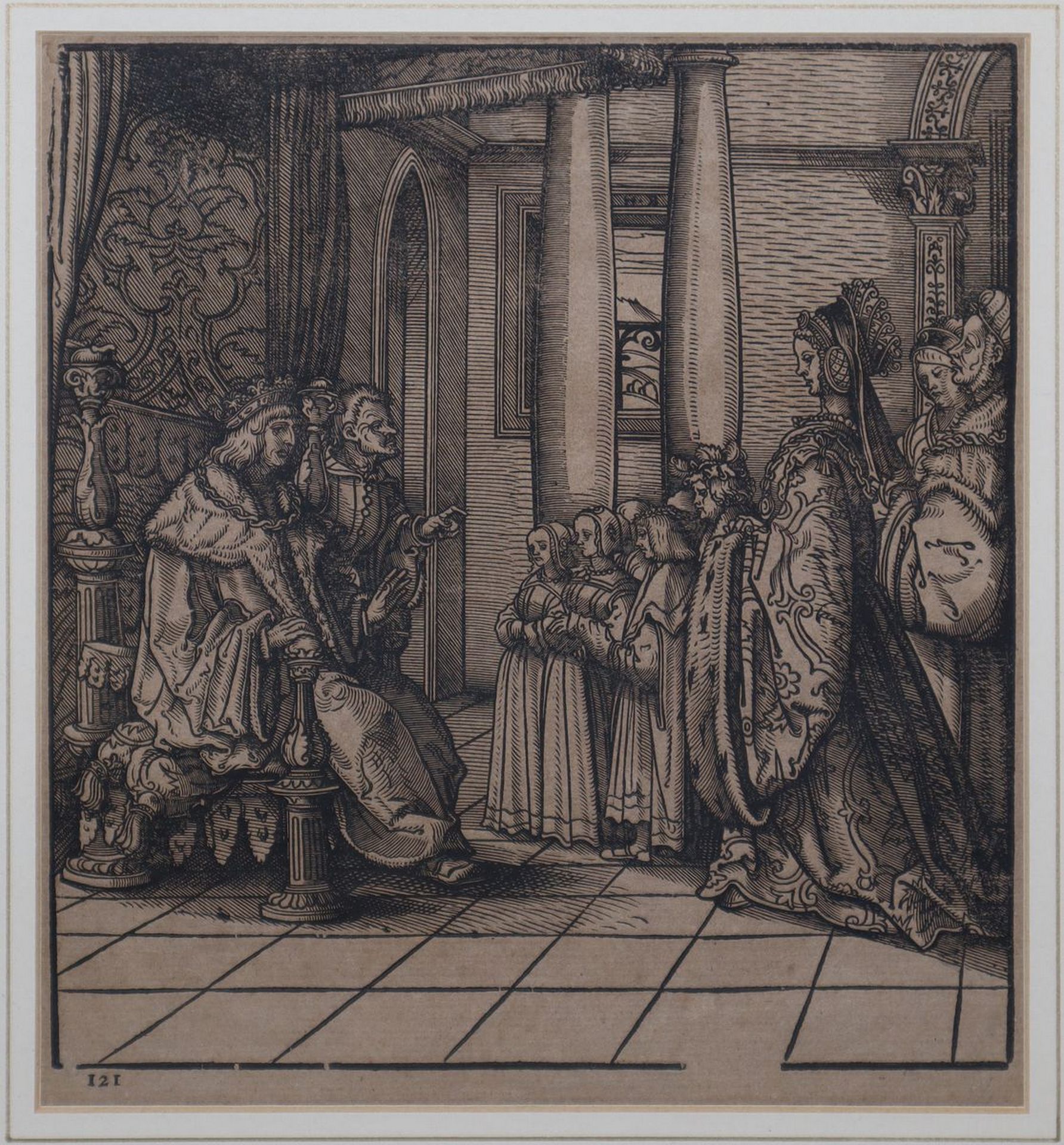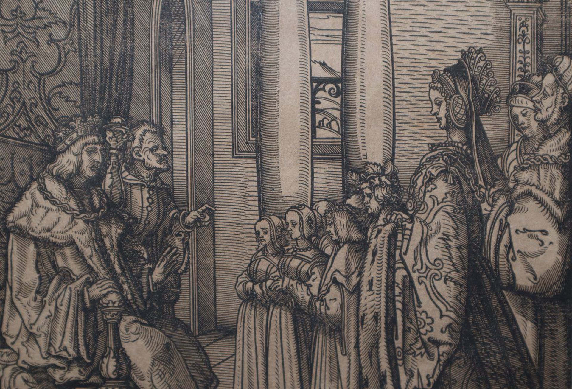 Hans Burkgmair (Augusta 1473 - Augusta 1531) - Il Re riceve sua figlia Margaret e i figli di Re Filippo, 16th Century cm 23,5 x cm 20,5; in cornice cm 50,5 x cm 41 Xilografia