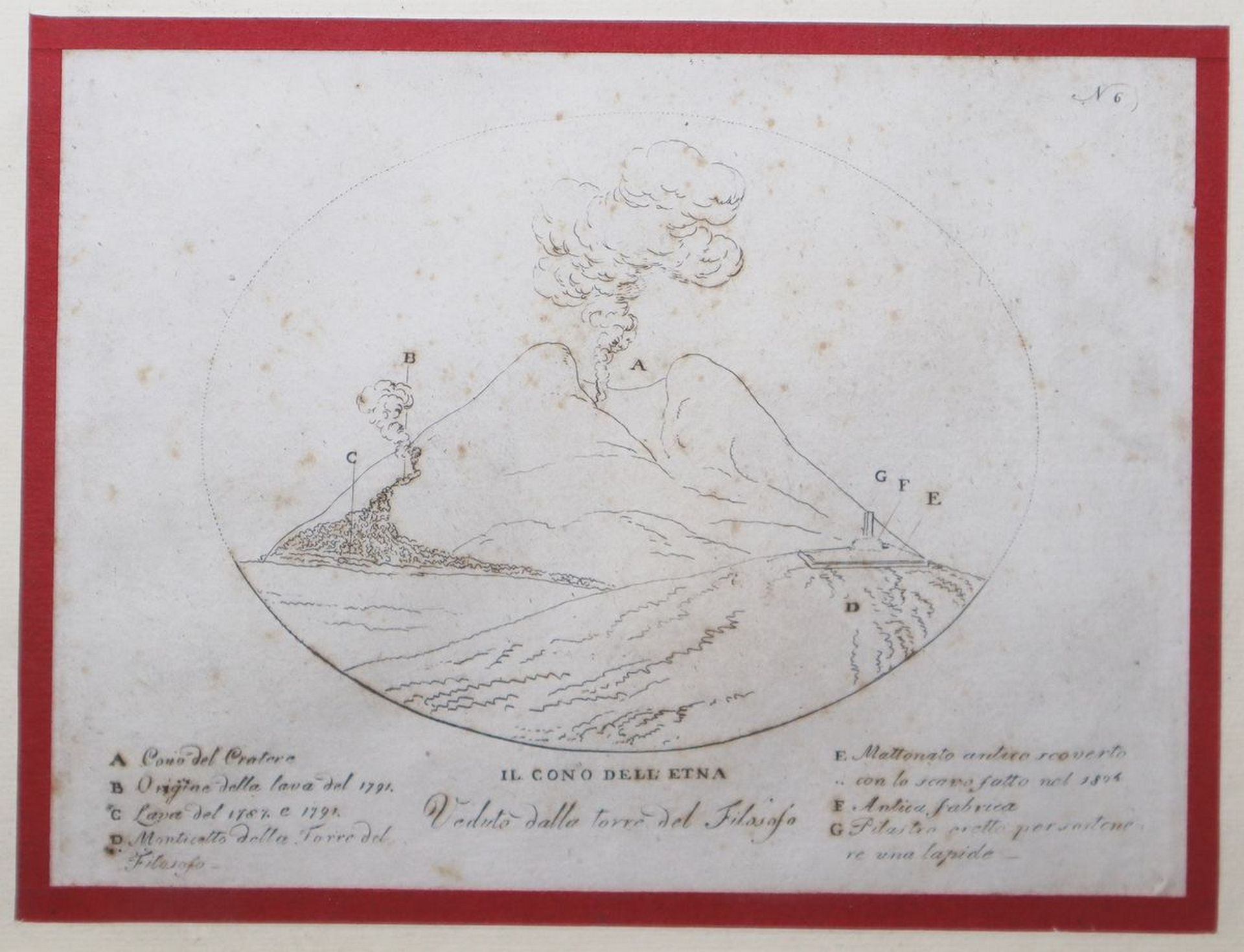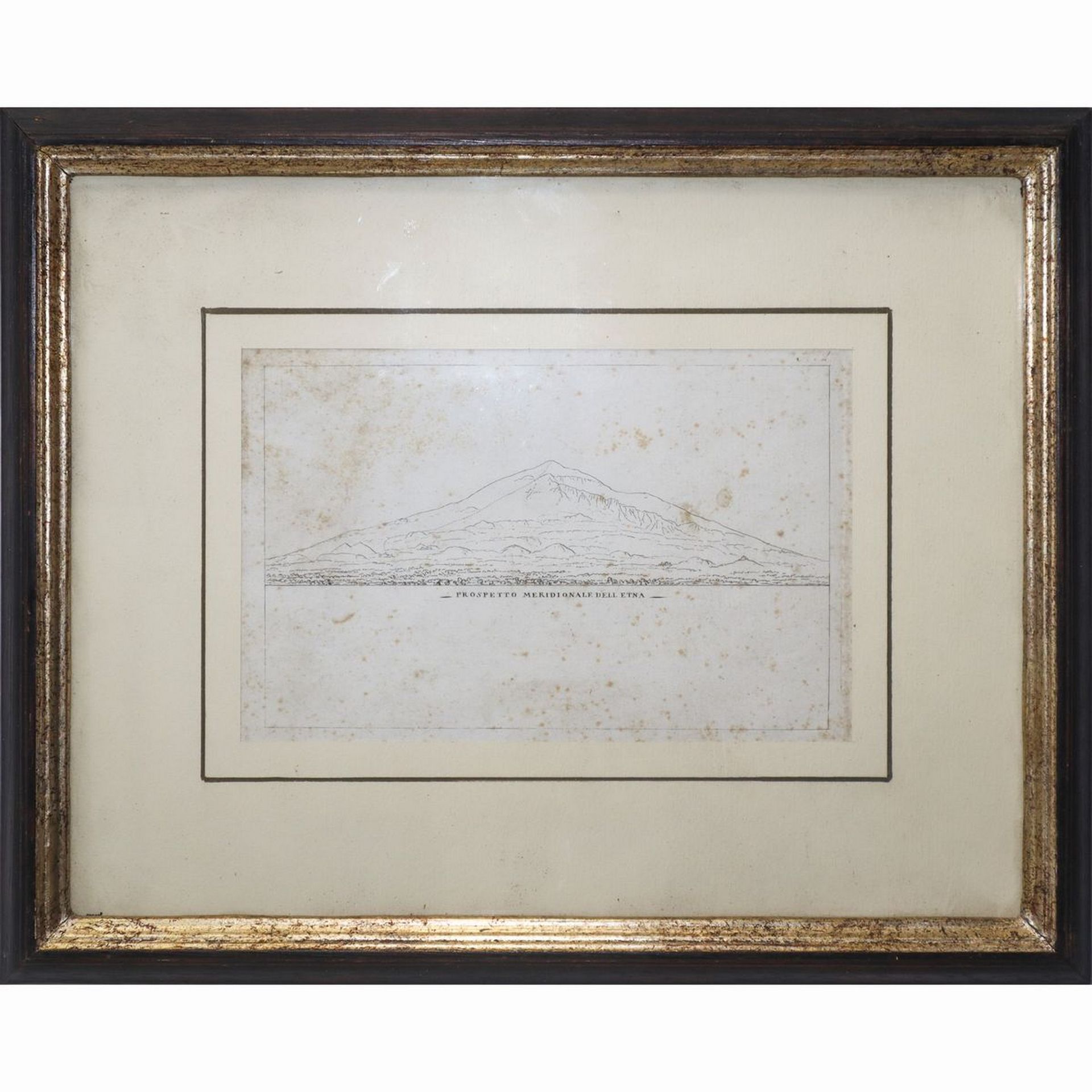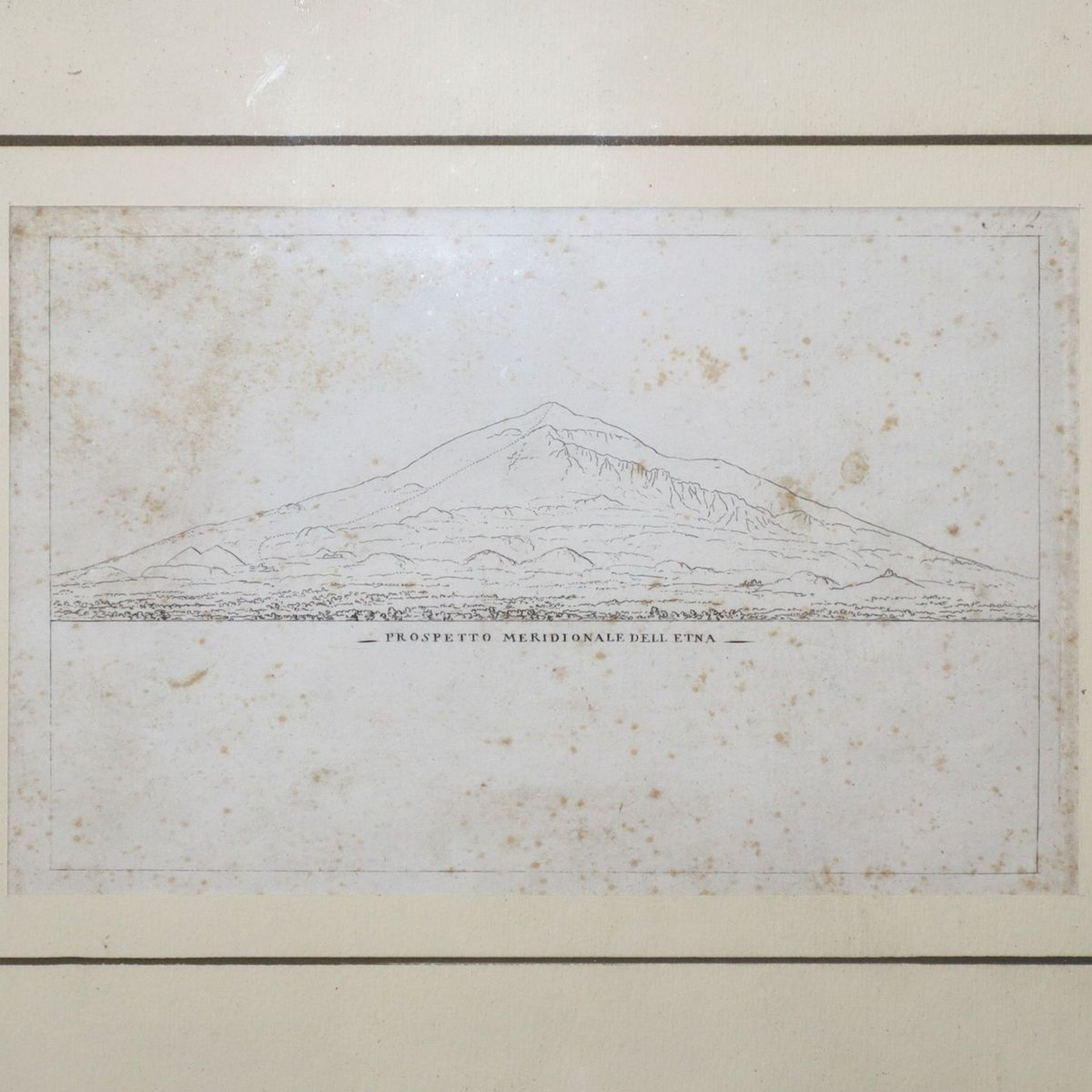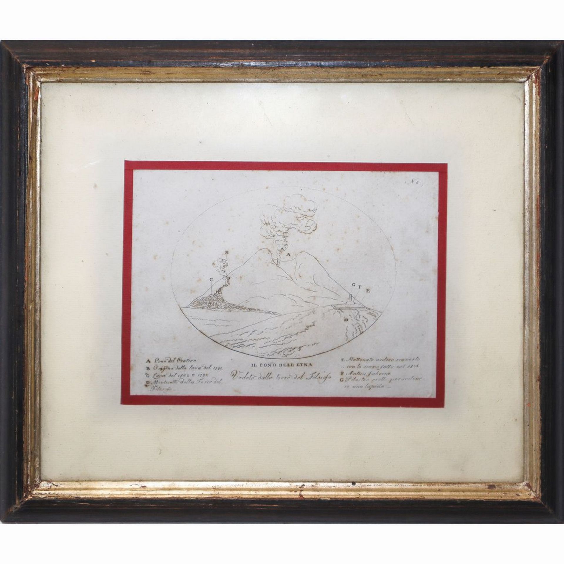 Coppia di incisioni raffiguranti cono del vulcano ed il prospetto meridionale , 20th century mm 111 x 151,in cornice cm 23,5x28 , mm123x189 in cornice cm 27,5x34 presente legenda che illustra l'origine della lava del 1791 sull'Etna