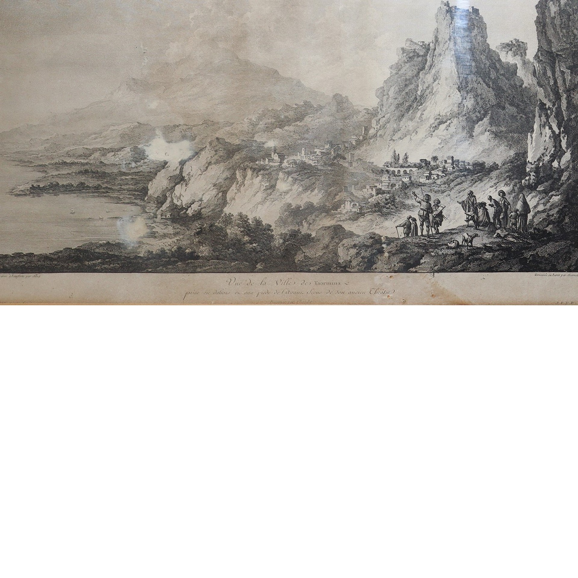Saint-Non - Vista di Taormina con Etna incisione tratta dal "Voyage pittoresque des isles de Sicile, de Malte et de Lipari", late 18th century cm 29X43 in cornice 49X64