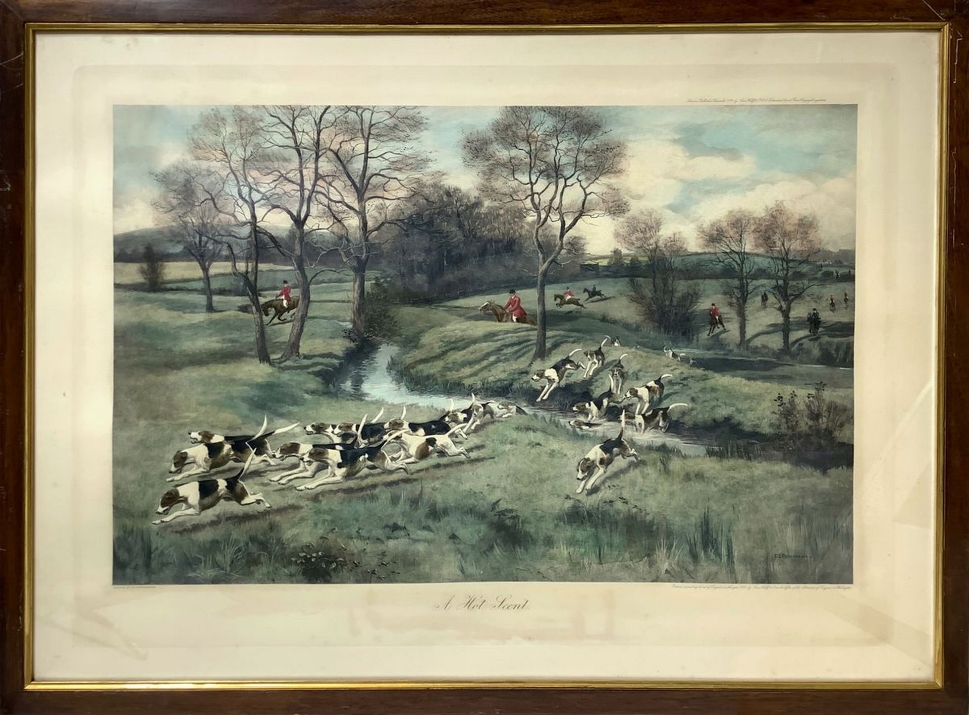 “A hot scent” scena di caccia alla volpe Mm 550x760, in cornice cm 61x81 Incisione ad acquaforte colorata a mano
