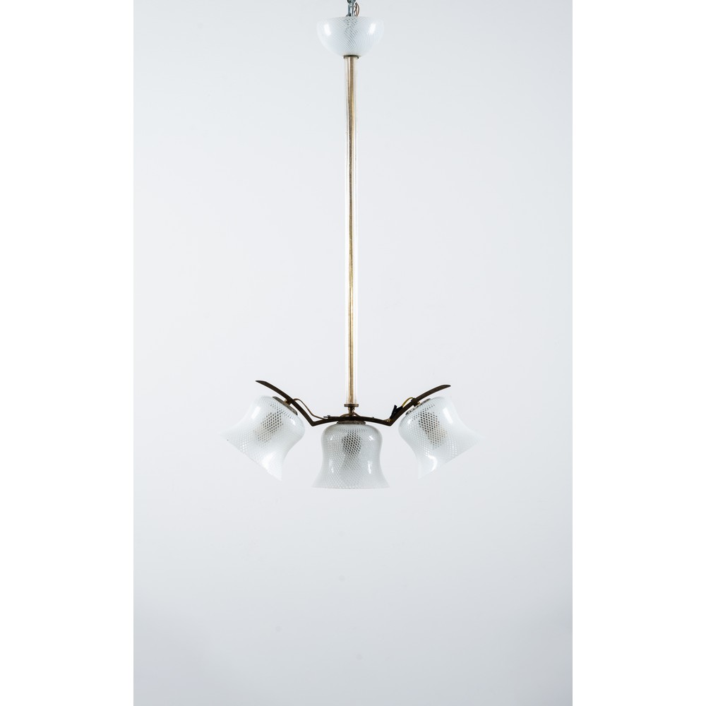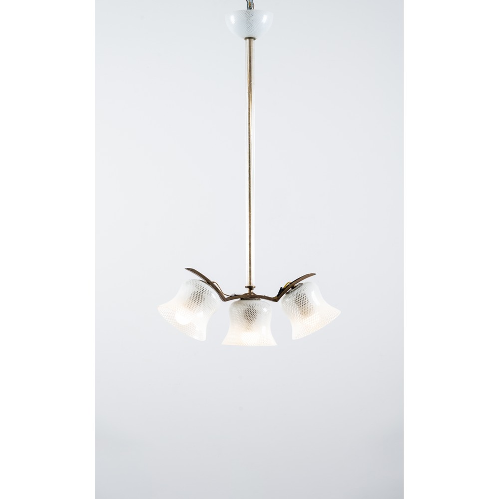Lampada a sospensione a tre luci, struttura in ottone con tre diffusori a tulipano sagomata in vetro a reticello.