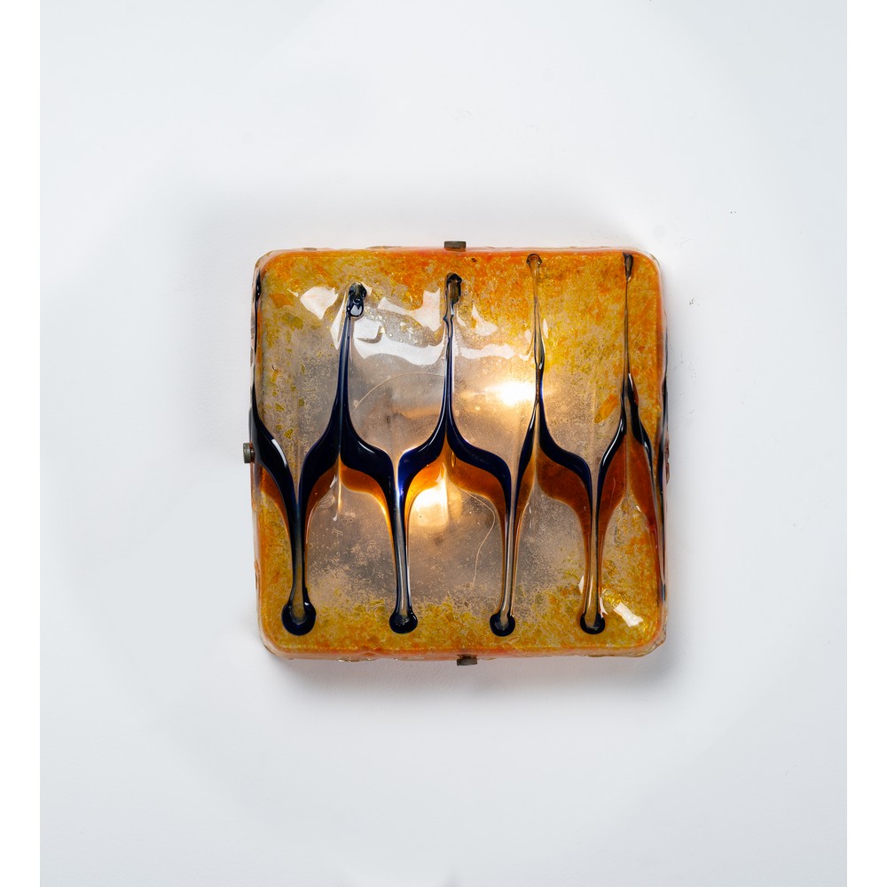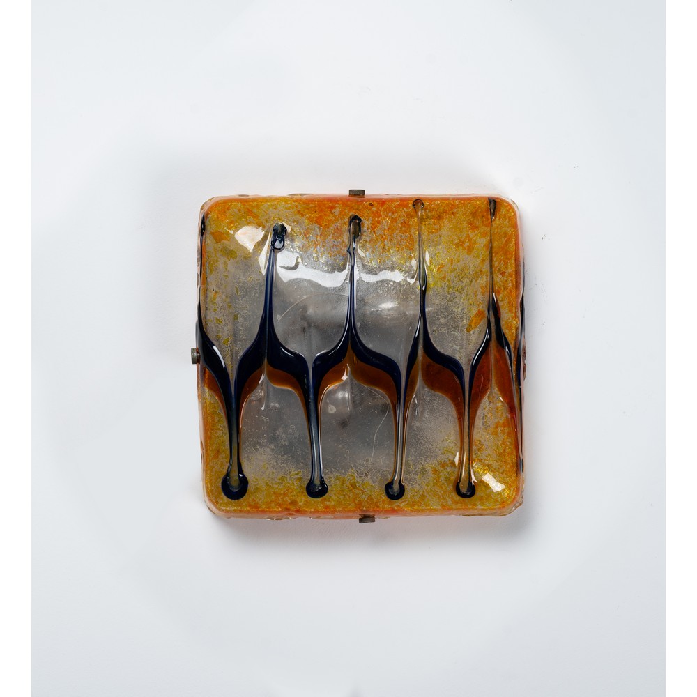 Lampada da soffitto o parete a due luci, corpo quadrato in vetro a decoro a fiamme policrome. Struttura in minuterie in metallo.