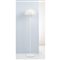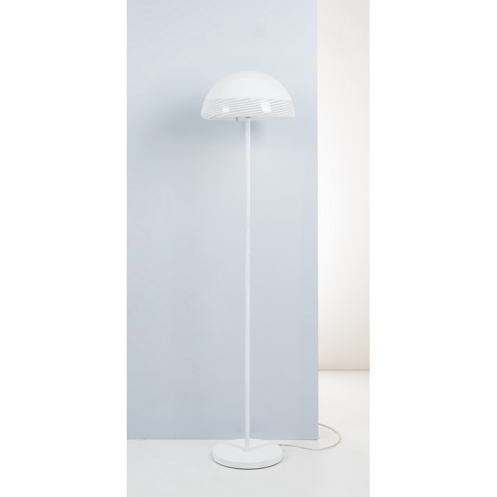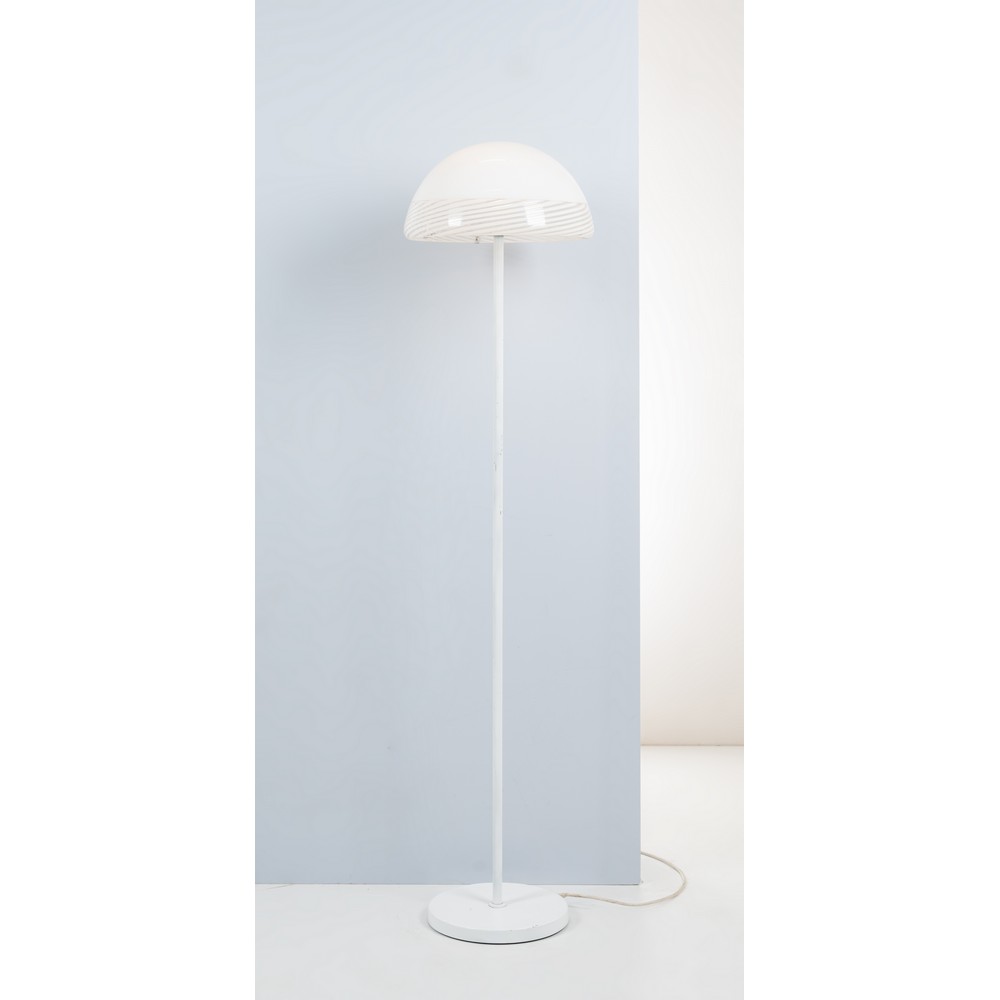 Lampada da terra con struttura in metallo verniciato bianco, diffusore semisferico in vetro lattimo parzialmente decorato in basso a mezza filigrana.
