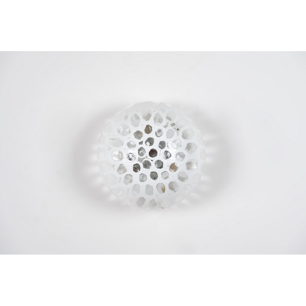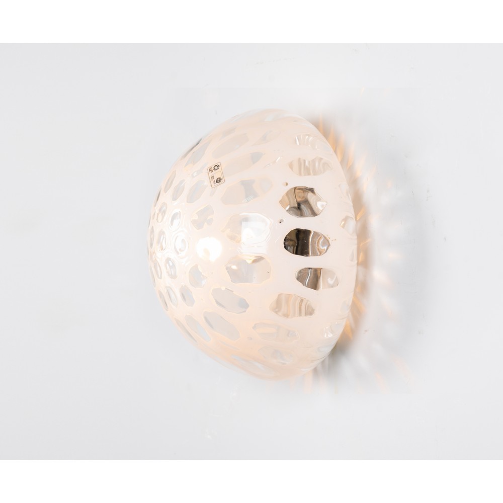 Lampada da soffitto o parete ad una luce, struttura in metallo con diffusore in vetro a decoro lattimo e incolore. Etichetta di produzione.