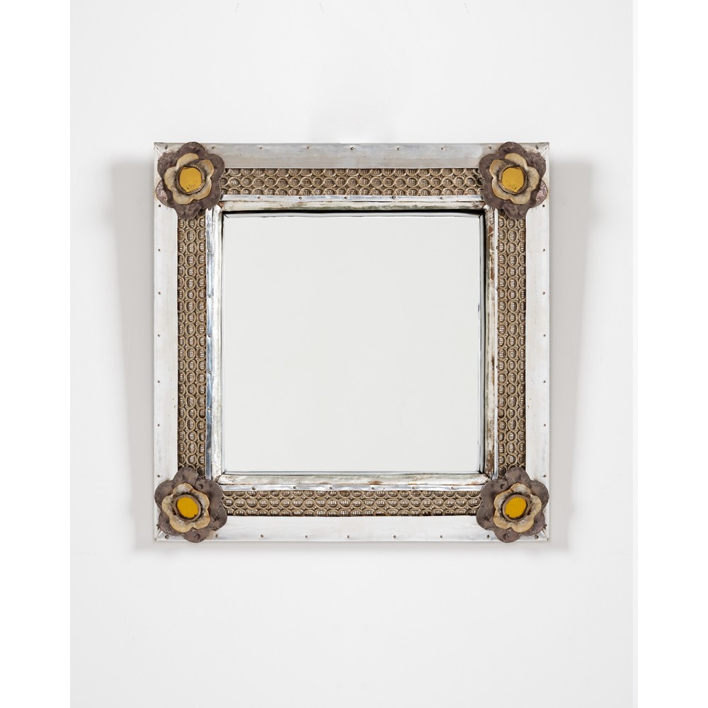 Specchio da parete quadrato, cornice in metallo decorata con fiori angolari e maglie ad anelli, cristallo specchiato. Firma retrostante.