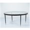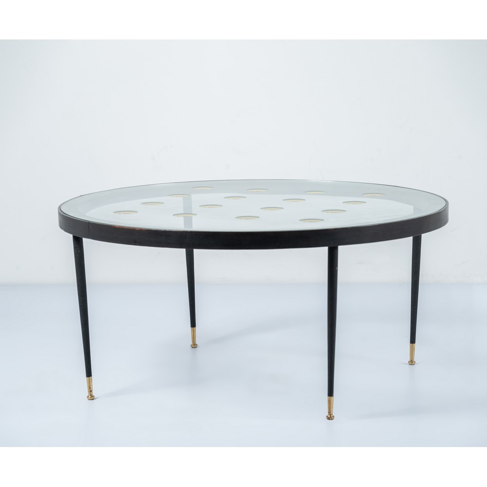 Tavolo da salotto modello “2660” con struttura in legno ed ottone, piano circolare in cristallo di grosso spessore decorato con inclusioni sferiche in ottone. Etichetta di produzione.