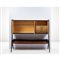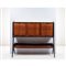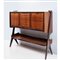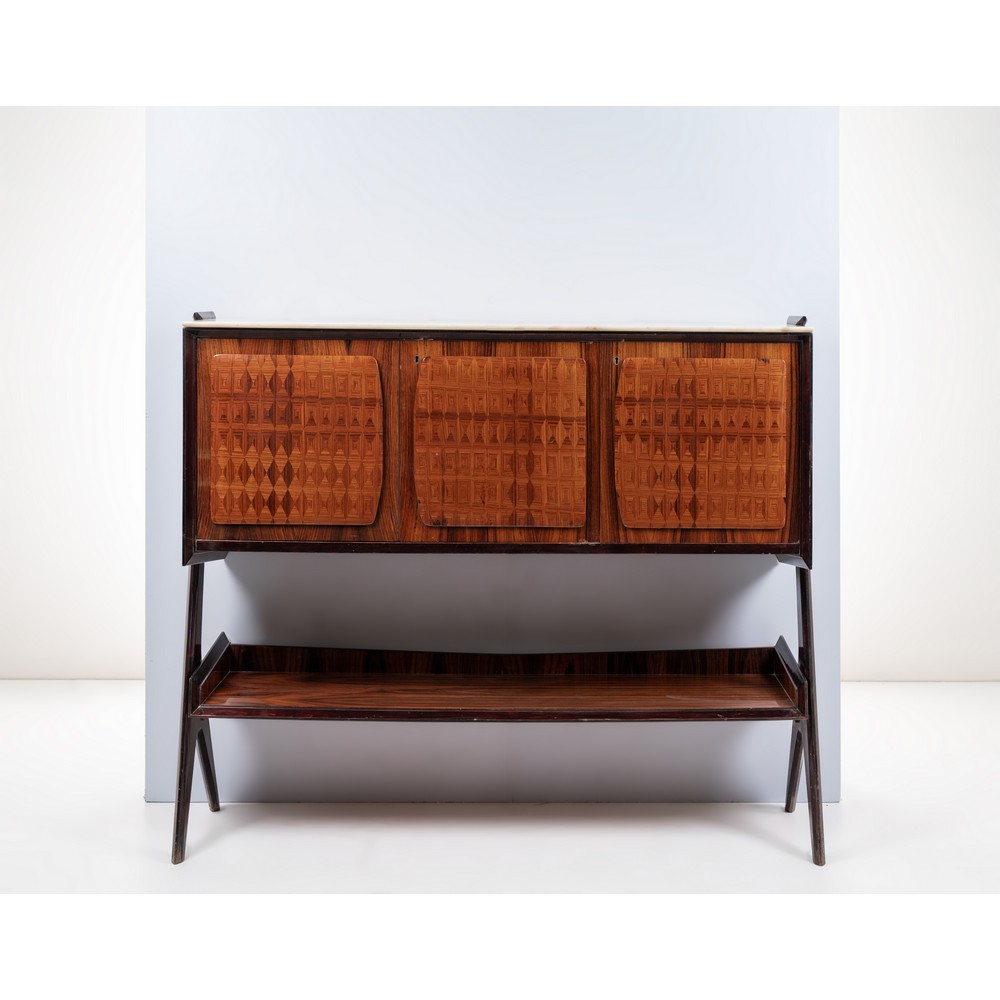 Mobile bar in legno esotico e legno di noce, piede alto a coda di rondine in legno ebanizzato, sul fronte un corpo sospeso diviso in due parti, da un lato un vano contenitore con mensola di vetro chiuso con due ante battenti, di fianco un vano con tre cassetti e un vano sovrastante chiuso con un’anta battente. Una mensola sottostante. Minuterie in ottone. Piccole usure.