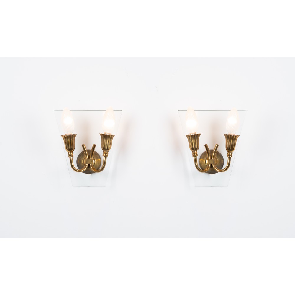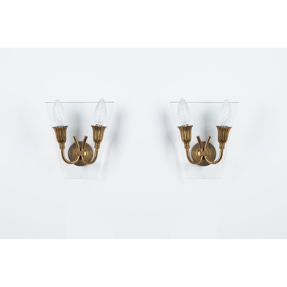 Coppia di lampade da parete a due luci con struttura in ottone, diffusore in cristallo curvato incolore.