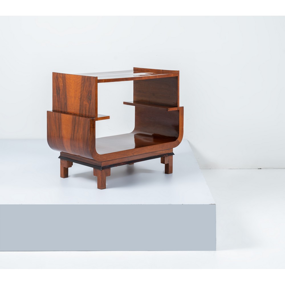 Mobile contenitore a giorno in legno di noce, fianchi curvato, piano rettangolare in legno.