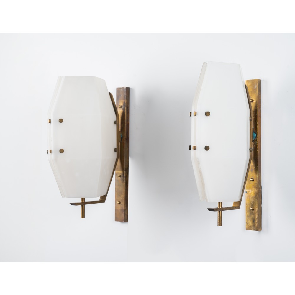 Coppia di lampade da parete ad una luce, variante del modello “12898” con struttura in ottone e diffusore ottagonale in vetro duplex opal bianco. Segni di uso.