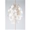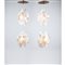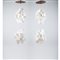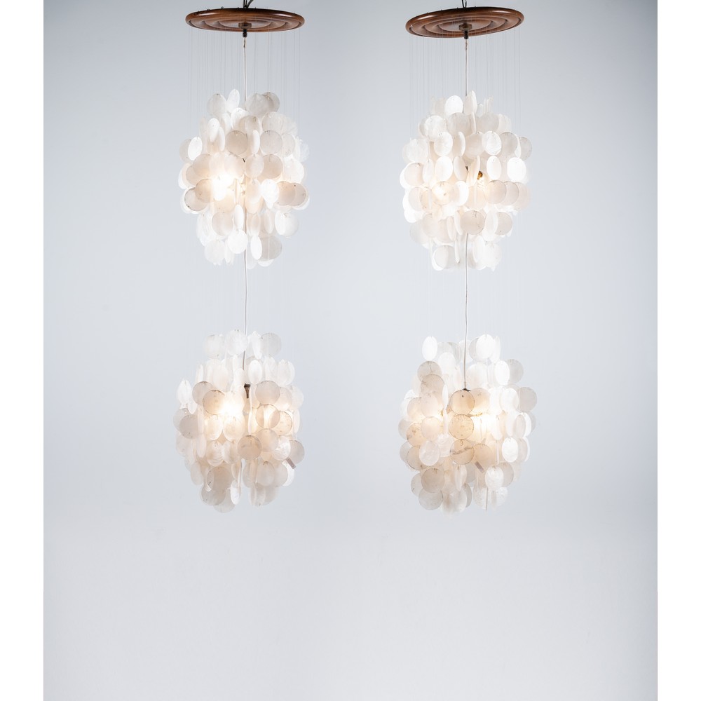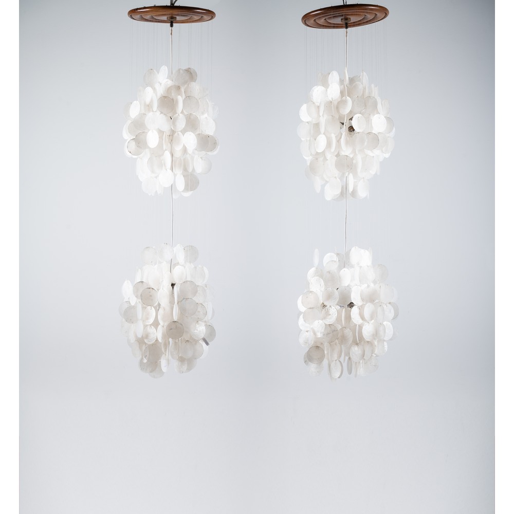 Coppia di lampade a sospensione a sei luci con struttura in legno, fili in nylon, diffusore composto da due globi in dischi di madreperla.