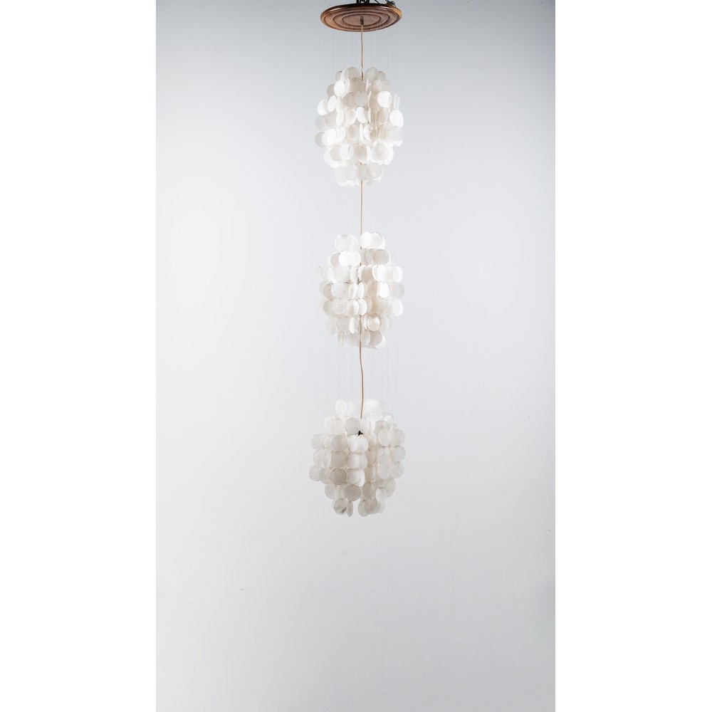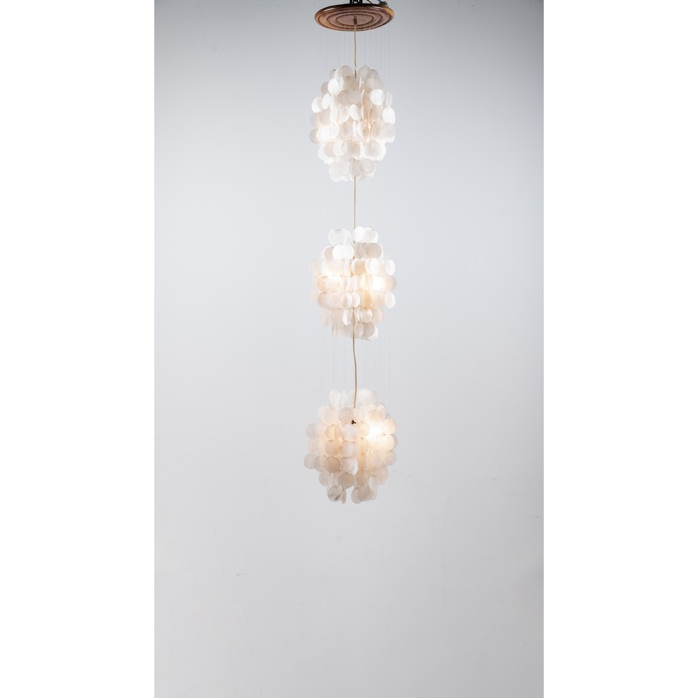 Lampada a sospensione a nove luci con struttura in legno, fili in nylon, diffusore composto da tre globi in dischi di madreperla.