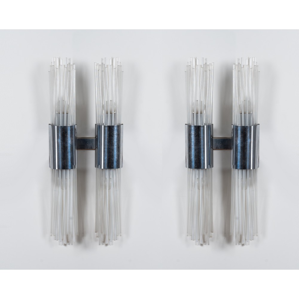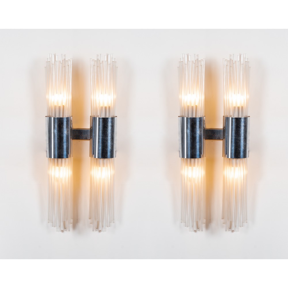 Coppia di lampade da parete a quattro luci, struttura in acciaio cromato, fusto regolabile in altezza, diffusore cilindrico composto da cannucce di vetro incolore e satinate.